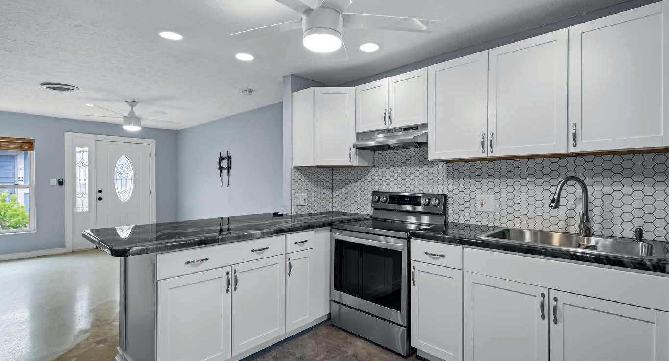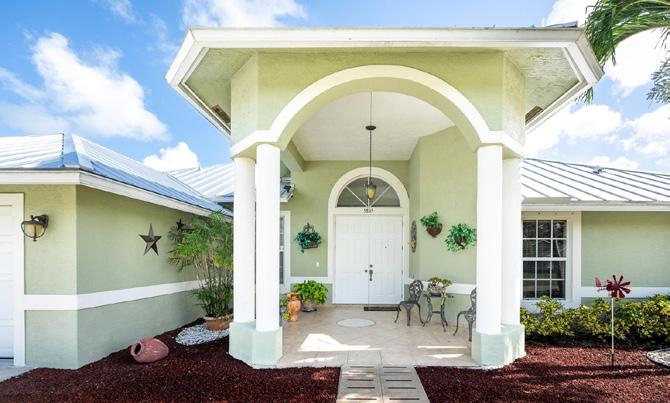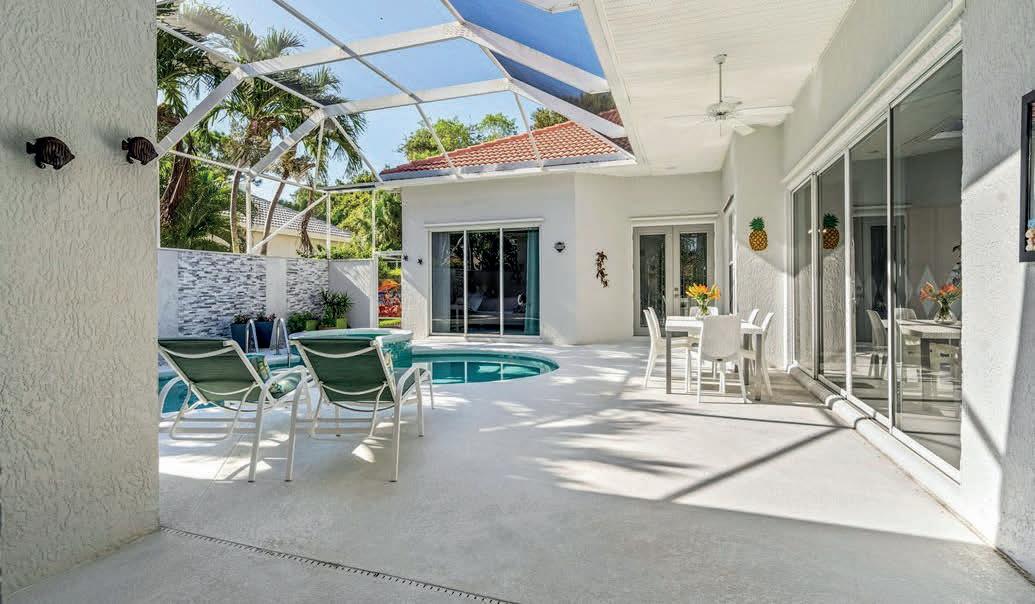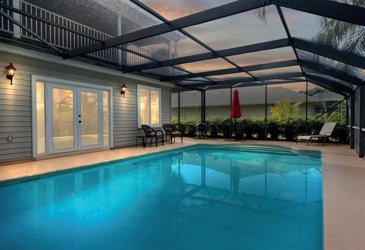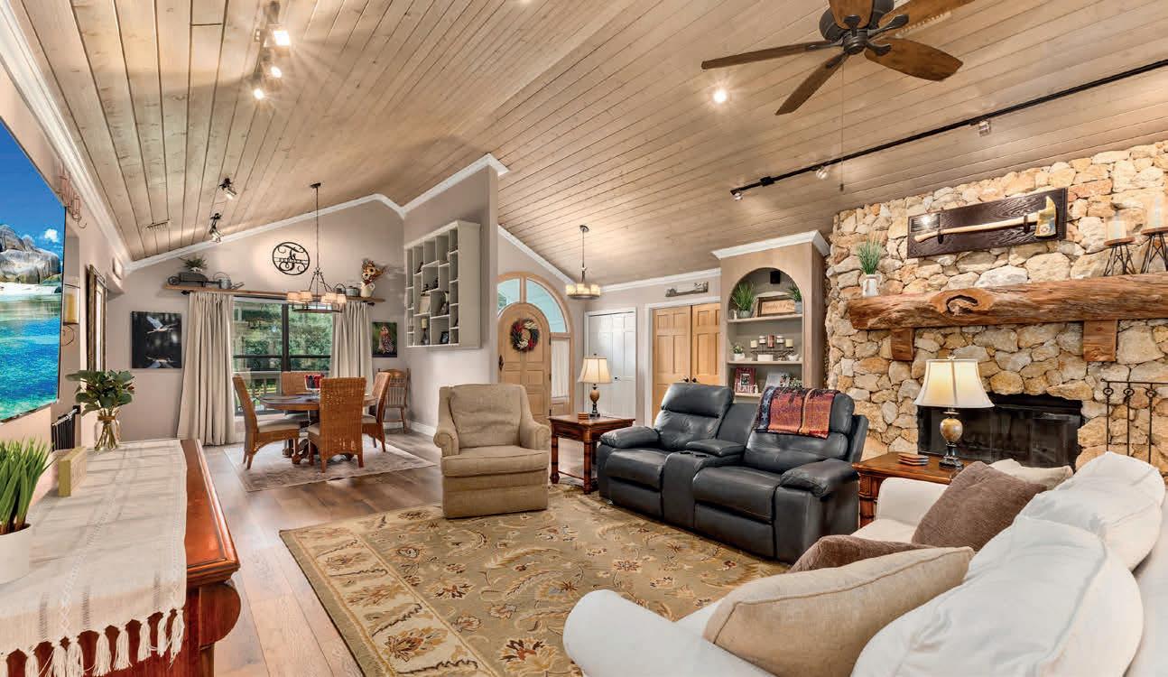 This updated Key West home on a 2.72-acre lakefront lot features a beautiful newer saltwater pool and a private island. The main house has three bedrooms and two baths with a split bedroom plan, a great room with a Coquina wood-burning fireplace, and a vaulted Pecky Cypress beamed ceiling. The lower level includes a theater room that can be used as an office, gym, or home school area, a shop area, a half bath, and a one-bedroom, one-bath guest apartment with access to a porch and pool. The property also has a three-car garage, an upstairs screened porch, and is ideal for multigenerational living. Located in a private, gated equestrian community, it offers tranquility and exclusivity. Offered at $1,290,000.