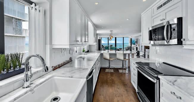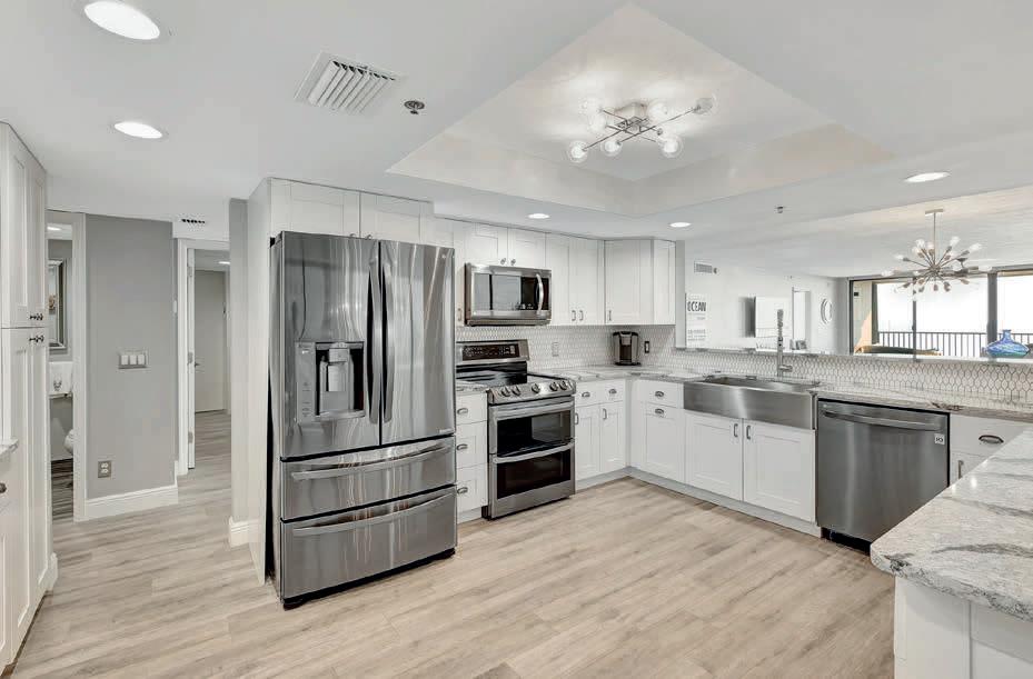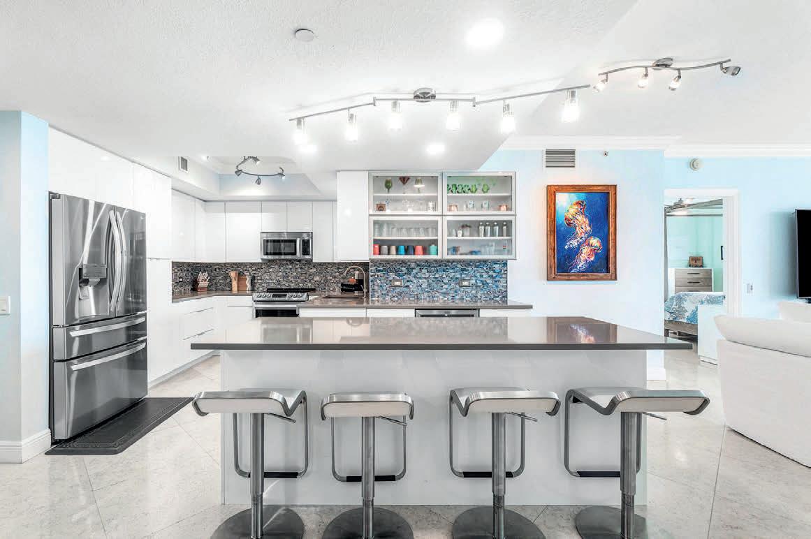 Upon entering, you are greeted by the expansive open-plan living area, where plank tile flooring stretches throughout, echoing the soft hues of the sandy beaches just beyond the doors. Floor-to-ceiling windows bathe the space in natural light, offering unobstructed views of the Atlantic Ocean. The living room, designed with modern furnishings and coastal-inspired decor, flows seamlessly into the dining ar creating an ideal setting for both relaxing and entertaining. Every detail, from the crown molding to the custom lighting, has been thoughtfully chosen to enhance the condo’s elegant yet welcoming atmosphere.