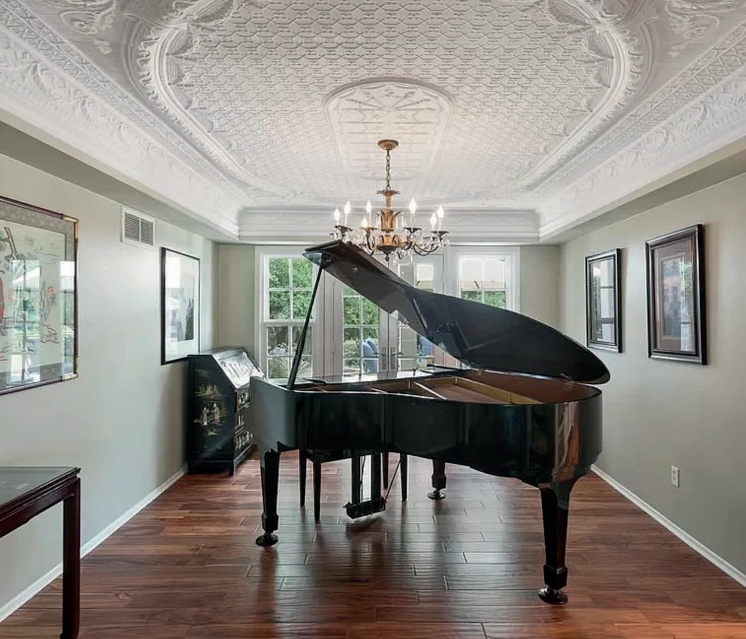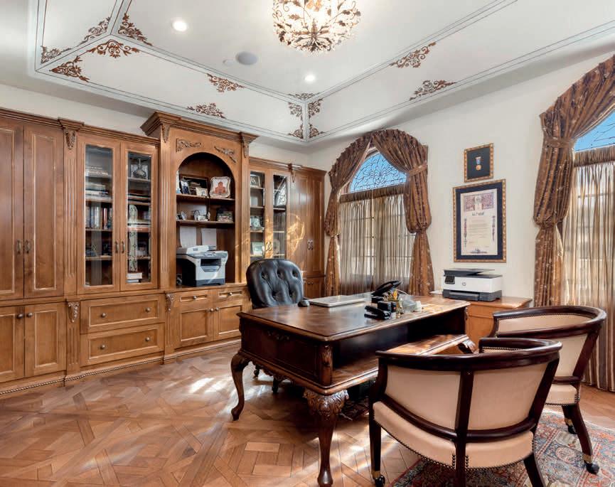 custom-built masterpiece nestled at the top of The Hill. This magnificent 5,876 sq ft estate was built with the finest luxury materials and craftsmanship. Featuring a stunning master suite, gourmet kitchen, coffered ceilings, hand-carved mantles, custom-designed maple parquet hardwood flooring, and a custom bar enclave plus a subterranean nine car garage with a chef prep kitchen, maid’s quarters, and a wine cellar. The true beauty of this estate lies in its ability to marry art and luxury into