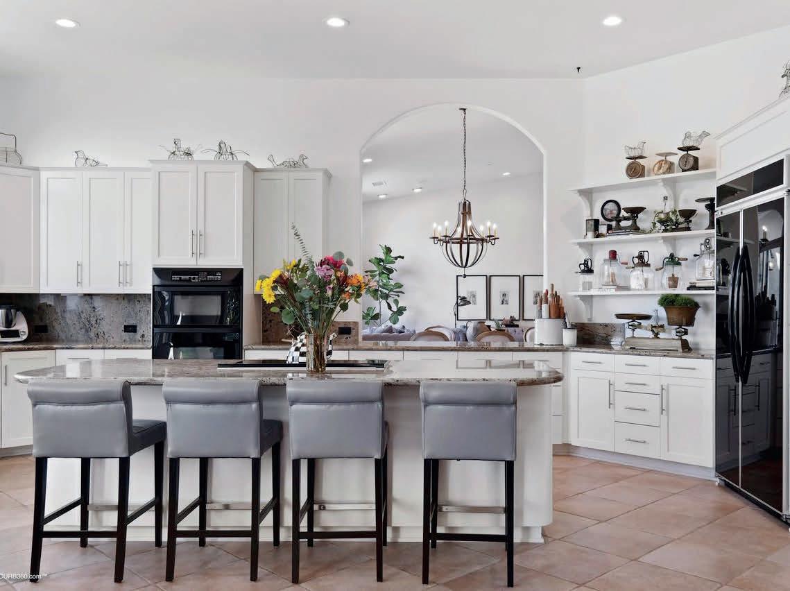 Other features include LED recessed lighting throughout, luxurious custom draperies, tankless water heater, on-demand expedited hot water delivery system, dual-pane window glass, water softener and a fully paid-off 3kW solar system.