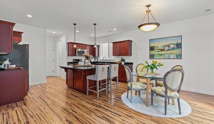 island kitchen opens up to the soaring vaulted ceiling great room,