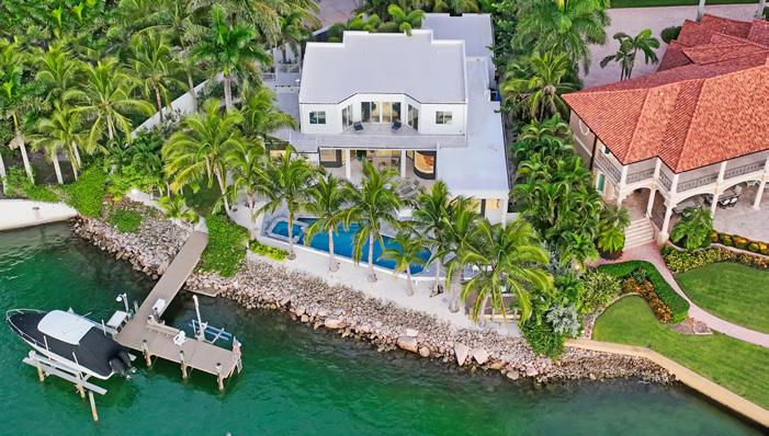 Welcome to Greystone Manor an iconic Venetian Palazzo Waterfront Estate unlike any other. This most prestigious residence encompasses 4 lots on 2.77 acres, commanding unobstructed wide and long water views from a protected deep-water cove on sparkling Robert’s Bay. Suitable for yachts with 191’ deep water frontage, 100’+ dock and water direct access to the Gulf of Mexico just minutes away. Opulent architectural details await, from the grey hewn stone exterior with copper roof, circular drive with Porte Cochere entry, to the regal 52’ square, 2700SF grand salon and 25’ hand-painted barrel ceiling embellished by Italian artisans.