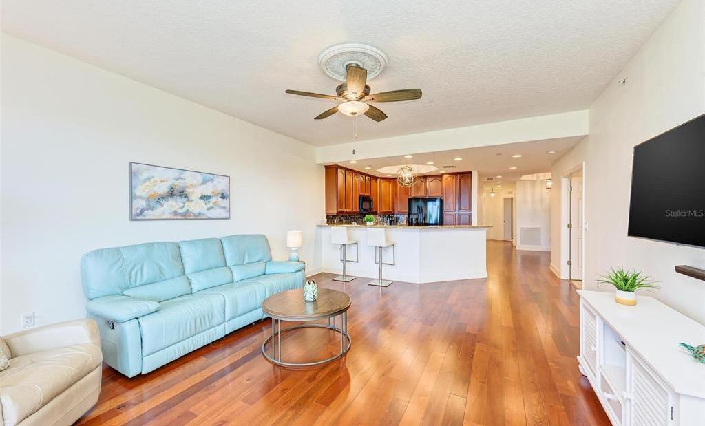 L ‘Ambiance on Longboat Key is the islands premier Gulf front community. If you dream of panoramic gulf views and spectacular sunsets, unparalleled lifestyle amenities and service, then welcome home to L ‘Ambiance. Located behind the gates of the prestigious Longboat Key Club and situated on the coveted South end of the island with easy access to St. Armands Circle and Downtown Sarasota, L ‘Ambiance provides private access to beautiful quartz sand beaches and stunning coastal beauty. A stylish lobby is first to greet you and your guests with modern seating, marble tile flooring and thoughtfully curated artwork. On the 5th floor a private foyer and alluring French doors welcome you to this 3 bedroom, 2/2 bath Sabal floor plan with over 2,800 square feet of living area. From the moment you enter the living room you will be captivated by beautiful views of shimmering gulf waters from floor to ceiling windows extending to the expansive terrace. The living room, with a built in entertainment wall, tray ceilings, and hardwood flooring, flows seamlessly to the dining room area. Dine while enjoying panoramic views of the Gulf of Mexico and stunning sunsets from the Gulf front terrace.