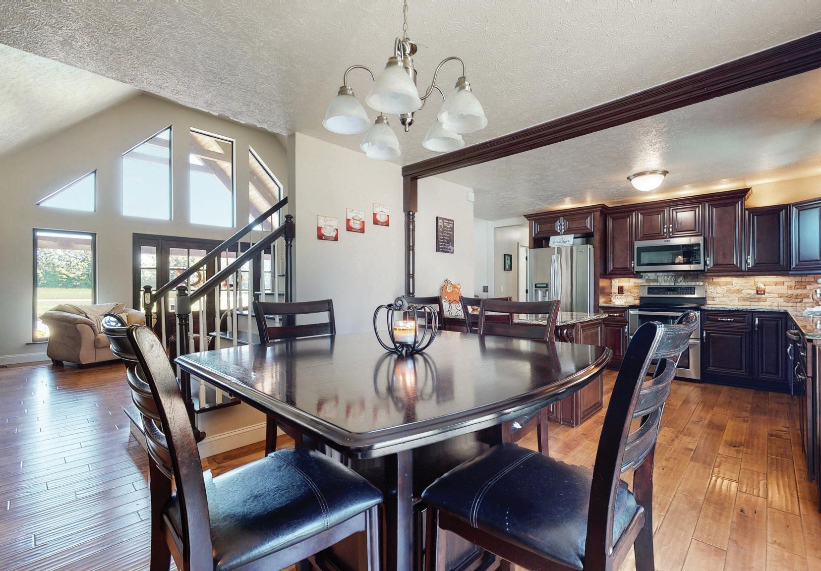Attention to every detail was taken on this custom built home! Sitting on 80 acres, enjoy beautiful sunsets, views and wildlife from the deck of this custom built home. With over 10,000 sq ft with 3 floors & a fully finished basement, the owners have taken pride with each detail. The first floor features hardwood floors throughout, a great room with dual fireplace open from the kitchen & living room, built-in bookcases, striking dining room, first floor laundry room, & mud room. The state of the art kitchen features travertine tile, stainless appliances, double ovens, dishwasher, garbage disposal, microwave, 6 burner gas stove with hot water pot filler, French door refrigerator with so much storage space, a walk in pantry, and butler’s pantry. This home has a working farm with fenced yard and barn.