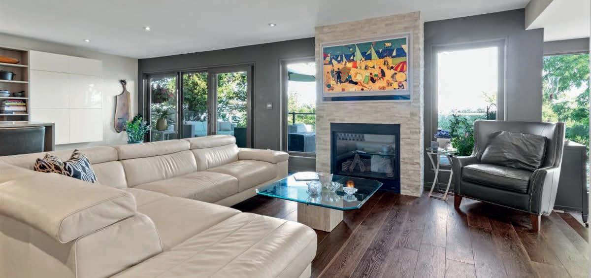 3 BEDS | 4 BATHS ( 3 FULL ·1 HALF ) | 2,226 SQ FT | $1,199,999 Live (and entertain) at the Lake! Large (over 2200 sq. feet) 3 bedroom bungalow. 3+1 baths (2 with heated floos), Fenced yard, double garage, part finishedbasement. 10’ and vaulted ceilings main floo, 10’ ceilings in basement. Huge dining room accommodates even the extended family! Quality kitchen (with pot fille) and built-ins throughout. Living room with gas fieplace walks out to sheltered veranda and fenced yard. Separate stairs to basement from the garage. Garden shed and some lawn equipment included. Custom gazebo with drapes.
