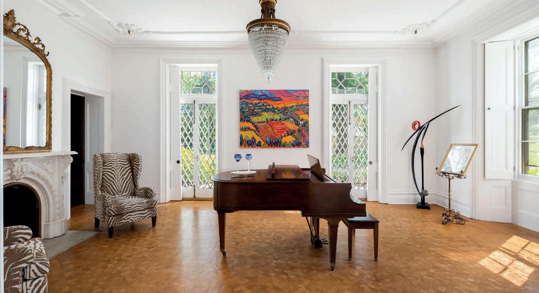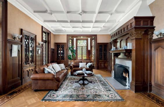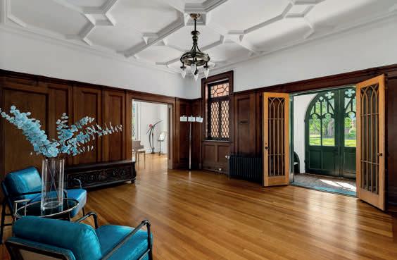 The Rest was designed as both a living work of art and an inviting home. The home celebrates the ethos of High Victorian Gothic Revival showcasing soaring tracery ceilings, gasolier-style chandeliers, floor to ceiling doors adorned with wood-framed diamond-patterned glass, and a Tiffany-style stained-glass window at its heart. Rich inlaid and parquet floors, full-height wood wainscoting, pocket doors and six original marble and wood fireplace mantels anchor the home. Glassfront-built-ins and intimate mullioned bay window seating invite the sharing of secrets.