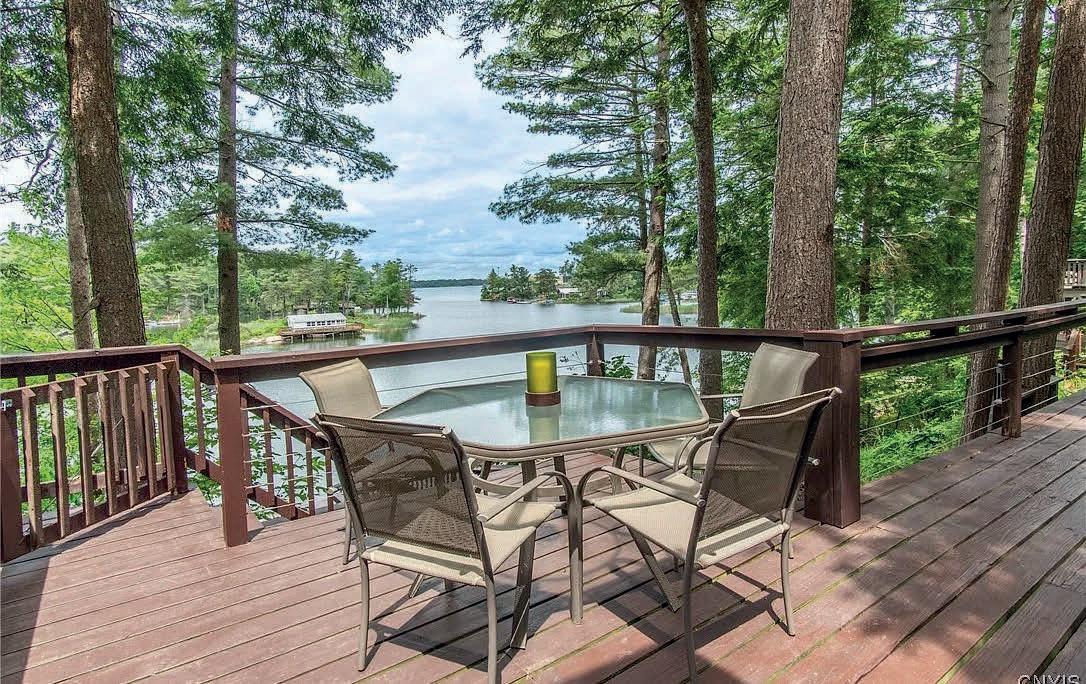 3 Beds | 2 Baths | 1,836 Sq Ft | $589,000 Your fully year round dream St. Lawrence River Home awaits! Nestled in the trees on over a half-acre with a generous level or privacy, this wooded gem boasts almost 2,000 sq ft of beautiful living space with all you need for 4 seasons of peace and serenity on the river! Boasting a beautiful open living space which includes a gorgeous custom kitchen with granite counter tops, dining area overlooking the river and spacious living room with also amazing views and a cozy woodstove! Plus 3 bedrooms and 2 bathrooms with a stunning master suite with balcony and retreat like spa bathroom! Entry area feels like a Florida sunroom and is the perfect mudroom, laundry storage area that could also be additional space for an office, den etc! The large decks riverside are perfect for all your BBQ’s, firepits, and gatherings of any kind with amazing views of the quiet protected bay off the river with main channel views through the cut! If you’re a boater, you will deeply appreciate the dock that is like new and the protected waters which are also great for fishing and swimming! You even have a bar/restaurant within kayaking distance at Hurricane Joes! Don’t forget!