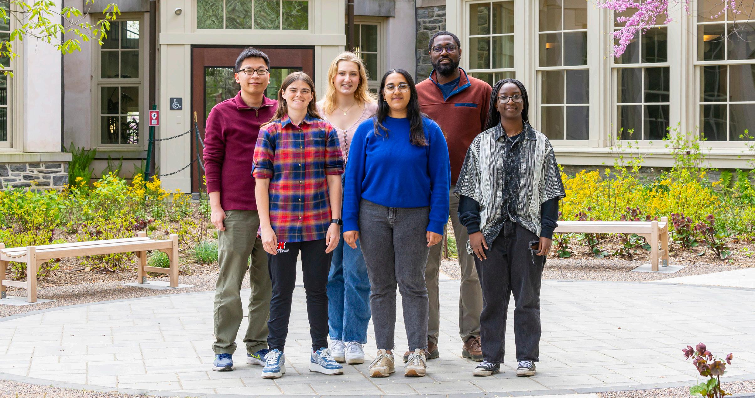 Professor Daly with his lab group in front of the KINSC. Left to right: Postdoctoral Scholar Zijian Huo, Theresa Haupt ’24, Katherine Conn ’24, Anagha Aneesh ’24, Assistant Professor of Chemistry Clyde Daly, and Khady Ndiaye ’26.