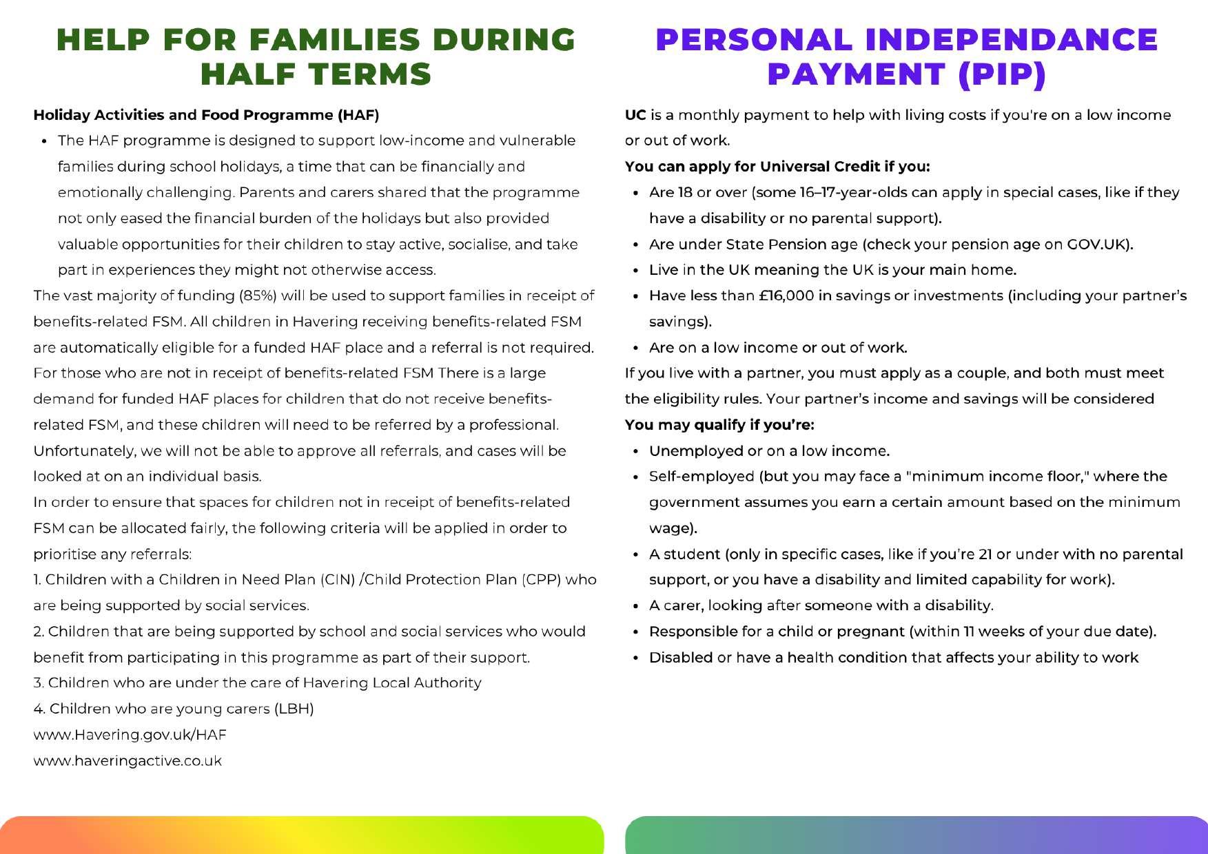 The vast majority of funding (85%) will be used to support families in receipt of benefits-related FSM. All children in Havering receiving benefits-related FSM are automatically eligible for a funded HAF place and a referral is not required. For those who are not in receipt of benefits-related FSM, there is a large demand for funded HAF places for children that do not receive benefits-related FSM, and these children will need to be referred by a professional. Unfortunately, we will not be able to approve all referrals, and cases will be looked at on an individual basis.