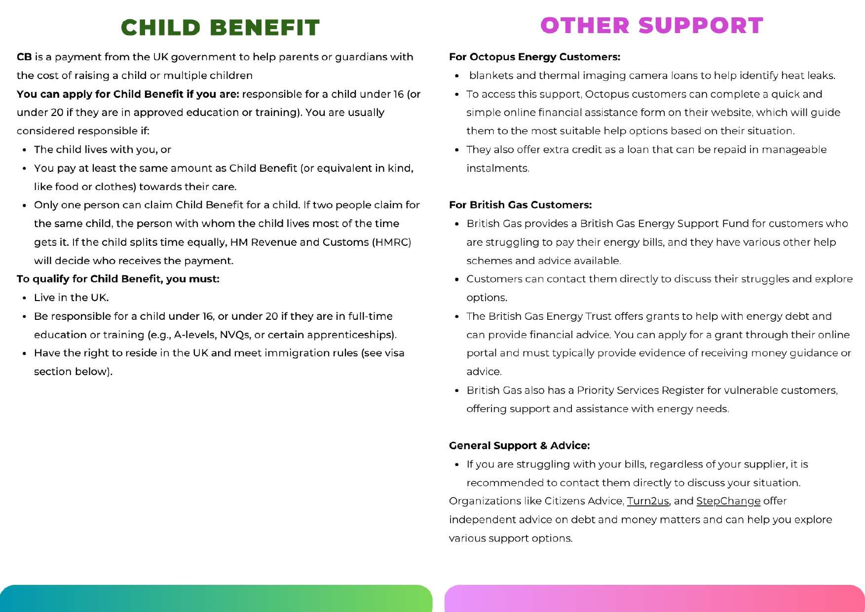 • If you are struggling with your bills, regardless of your supplier, it is recommended to contact them directly to discuss your situation.