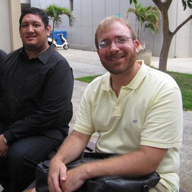 2012 PMI Clinicians KeAnuenue Hayashi (Low Brass) and Geoff Stone (Double Bass) take a breather before the chamber music recital.