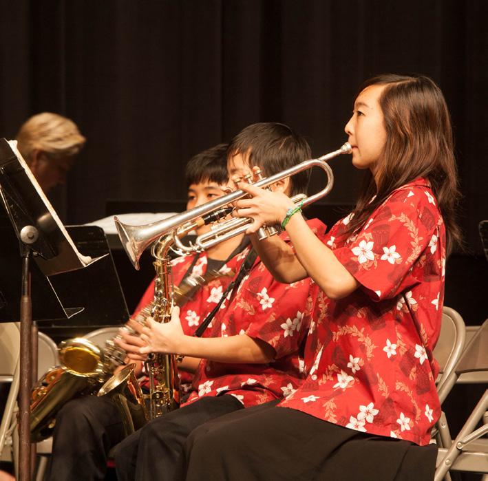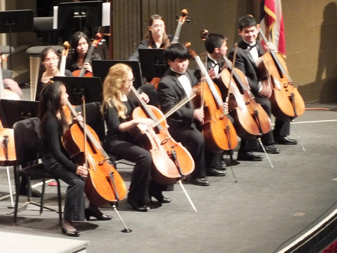 Cellists in the Intermediate String Ensemble, taught by Helen Fong, are shown here focusing intently on making music. Beyond ISE are two more orchestras, String Orchestra and Concert String Orchestra, both conducted by Chad Uyehara