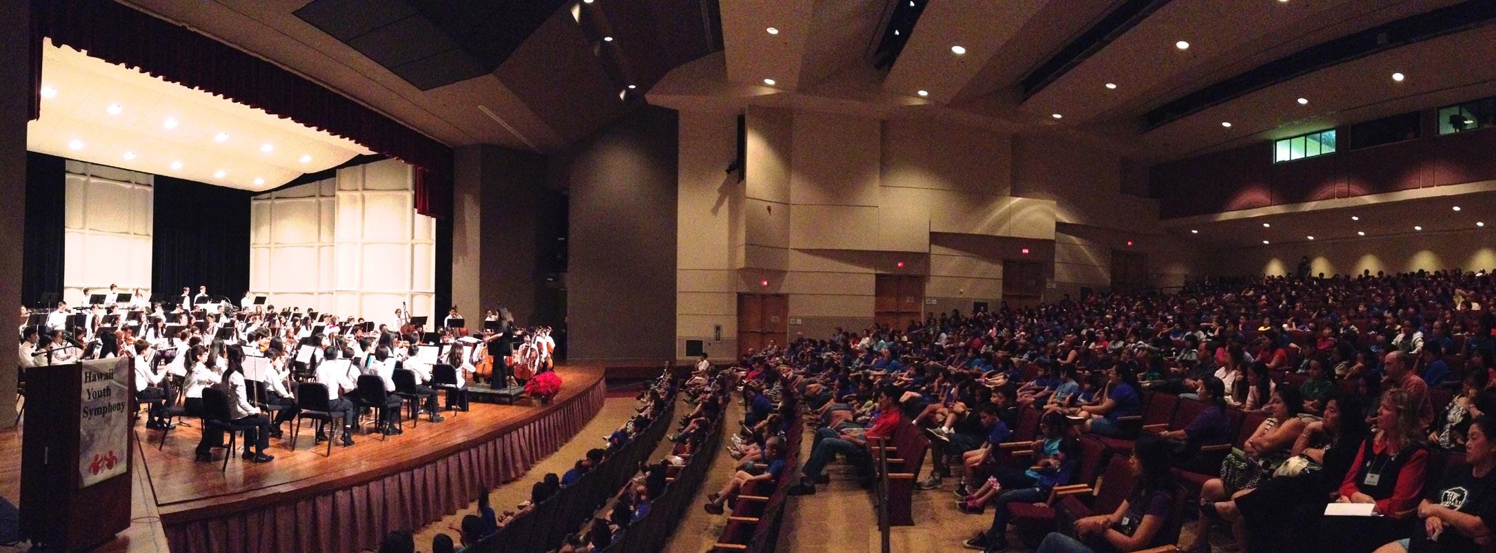 From December to February, the nearly 300 students in our three Symphony Program orchestras (YSI, YSII & CO) performed a total of ten Listen & Learn educational concerts. The concerts, offered as free-of-charge arts services to all public, independent, and home school students, were performed on Oahu at Pearl City Cultural Center and Blaisdell Concert Hall; and on Kauai at the War Memorial Convention Hall. Some 13,400 school children from 91 schools, and their teachers attended! Teachers receive pre-service teaching materials, including student worksheets, audio CDs, and program notes to help guide student preparation.