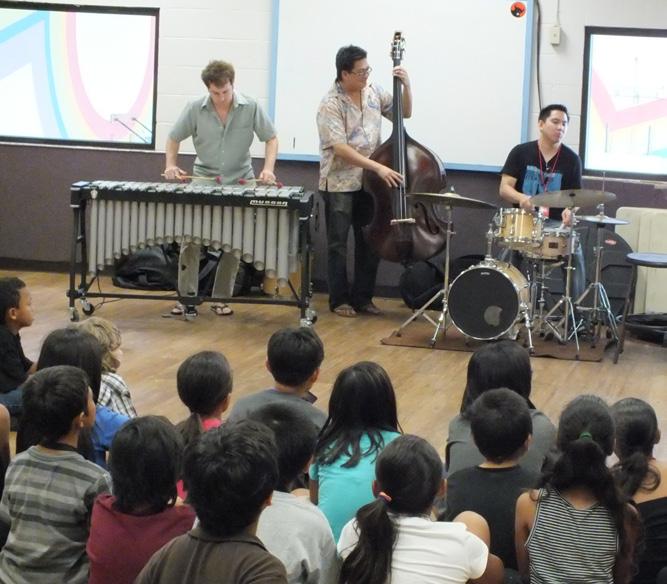 To help ensure that all students in the Clubhouse have access to music, HYS brings professional artist-teachers throughout the year. In these pictures, members of the visiting exotica group The WAITIKI 7 perform for Clubhouse kids. Drummer Abe Lagrimas Jr. ‘02 and our E.D. Randy Wong (also bassist) introduced the students to the exotic music of Martin Denny and Arthur Lyman, which originated in Hawaii in the 50s but is now rarely heard. ♫