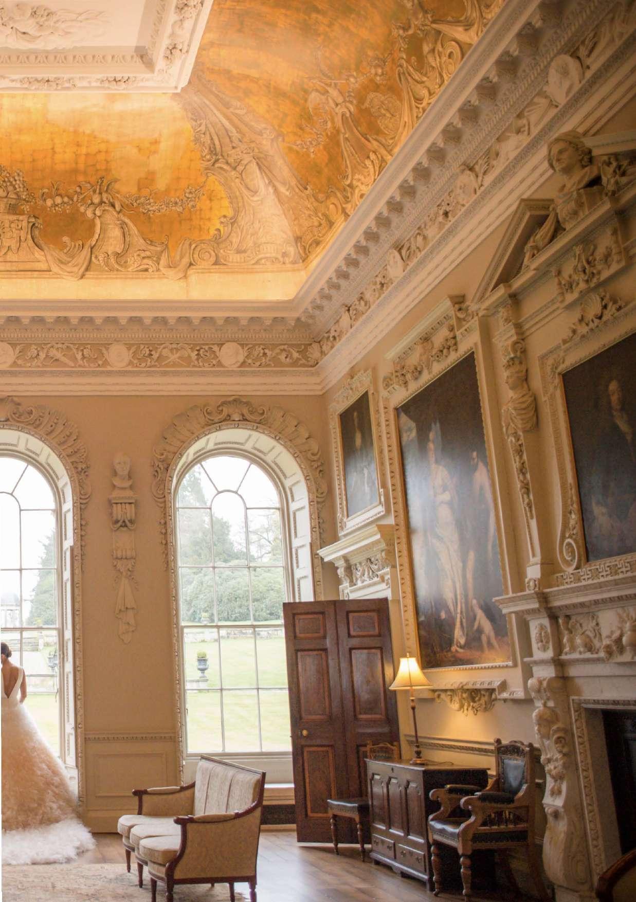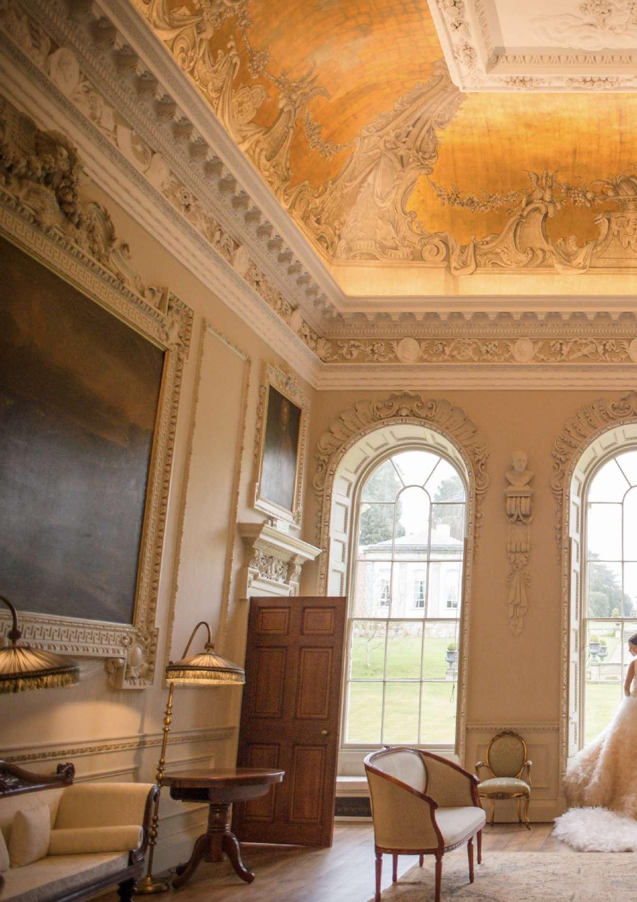 FROM THE INTRICATE LY DE TAILED CEILING OF THE BAL L ROOM AND THE HUGE ARCHED WINDOWS OF THE SA LOON . TO THE GRANDEUR OF THE CHAPEL AND THE ABUNDANCE OF LIGHT IN THE WINTER GARDEN .