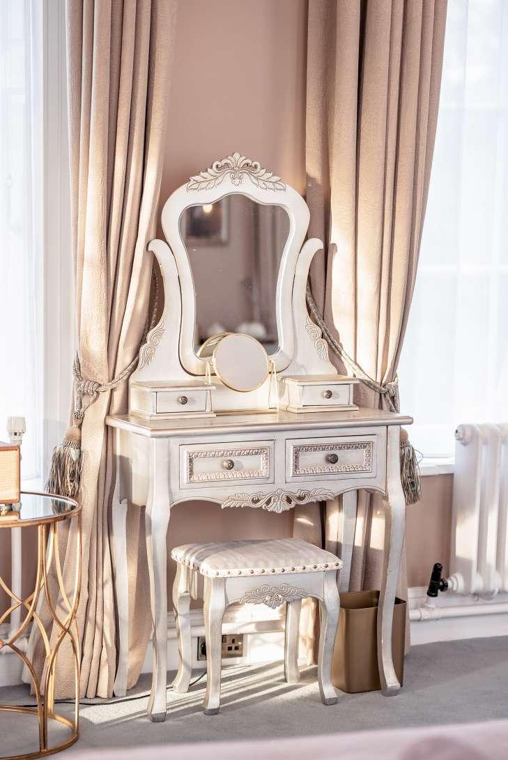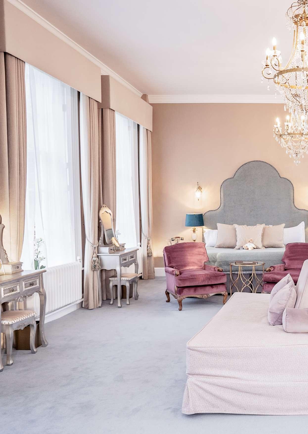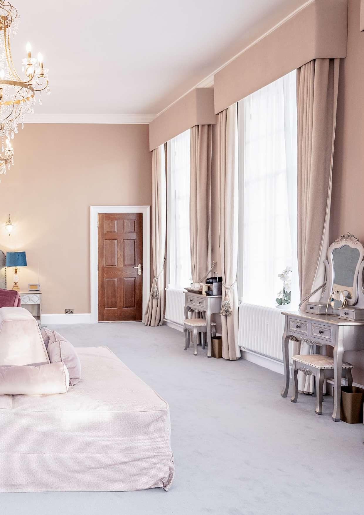 YOUR BRIDAL SUITE ENJOYS ; 15 LARGE SASH WINDOWS , FOR BILLOWING N ATURAL LIGHT , A PRI VATE ENTRY CORR I DOR , A HUGE BATHROOM SUITE WITH WAL K - IN SHOWER , CAST - IRON BATH TUB , MARBLE TO P P E D HIS & HERS VA N I T Y & SEPAR ATE WC. PRI VATE DRESSING AREA , PERFECT FOR HANGING YOUR WEDDING DRESS , AN EMPRESS SIZED , 7 FO OT BED , BANQUE T T E ST Y L E SE ATING & RELAX ATION AREA , A KING - SIZE DAYB E D , SUI TABLE FOR SLEEPING 2 BRIDESMAIDS IF REQUIR ED. AVAILABLEFORUPTO6PEOPLEINTOTAL.