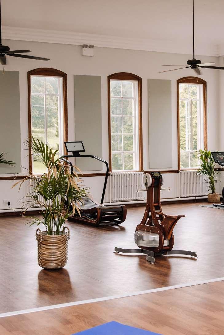 FOR THOSE LOOKING TO REENERGISE , THE BRAND NEW ORANGERY GYM OFFERS A GLORIOUSLY BRIGHT SPACE TO WORK - OUT IN , WITH STATE OF THE ART PELOTON SPIN BIKES AND EXQUISITELY DESIGNED NORD EQUIPMENT , ALL OVERLOOKING HUGE GLASS WINDOWS INTO THE ESTATE . A VARIETY OF VIRTUAL STRENGTH , HIIT AND MEDITATION CLASSES ARE ALSO AVAILABLE VIA A LARGE ON - DEMAND PROJECTION SCREEN .