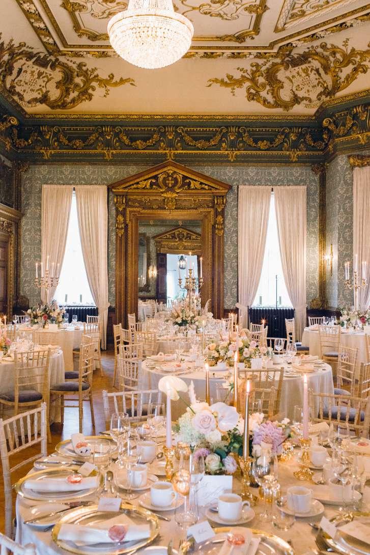 FROM THE INTRICATE LY DE TAILED CEILING OF THE BAL L ROOM AND THE HUGE ARCHED WINDOWS OF THE SA LOON . TO THE GRANDEUR OF THE CHAPEL AND THE ABUNDANCE OF LIGHT IN THE WINTER GARDEN .