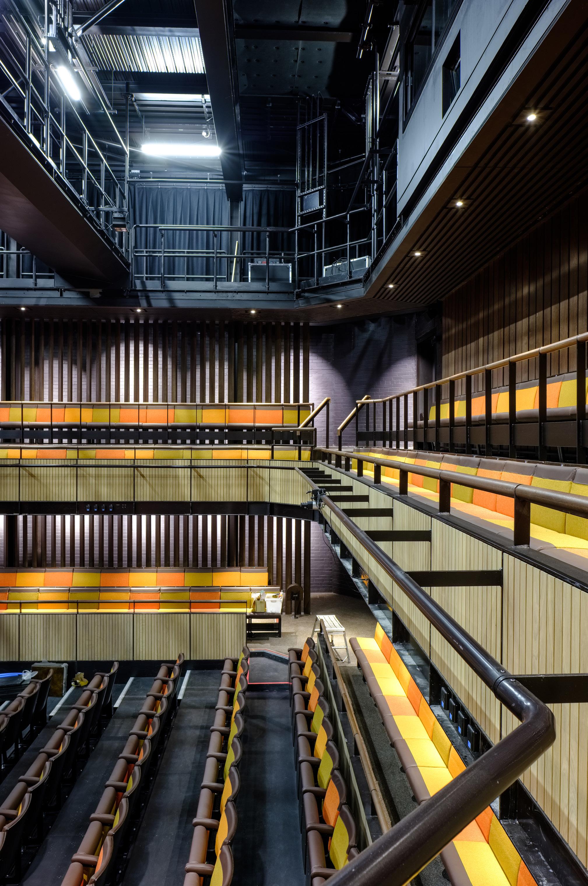 The Perse School has an extensive programme of music and drama activities which had outgrown its previous facilities. The Performing Arts Centre is named after Peter Hall, who was a pupil at the school from 1941-1949. This new centre includes a 400 seat auditorium, an adaptable foyer space that incorporates a large, daylit rehearsal and teaching room, an exhibition space and full back of house dressing rooms, workshop and ancillary spaces, along with a suite of classrooms. The triple-height, galleried foyer with a ‘diagrid’ timber roof structure, is naturally daylit and overlooks a landscaped courtyard which will form the new heart of the school. The space operates as a café for pupils and staff during the school day, and as a foyer for audiences during events in the auditorium. Spanning the full width of the courtyard, the highly glazed foyer allows views in and out of the building and blurs the boundary between interior and exterior. The auditorium is a rich, dark timber-lined space to contrast with the pale timber foyer. A suite of dressing rooms and technical spaces complete the theatre accommodation. The Performing Arts Centre incorporates full backstage facilities, enabling students to experience all aspects of staging a production and build on the activities of its thriving technical theatre company. As with much of our theatre work, and particularly for the resilience required of a school, materials have been chosen for their durability and capacity to mature and change over time.