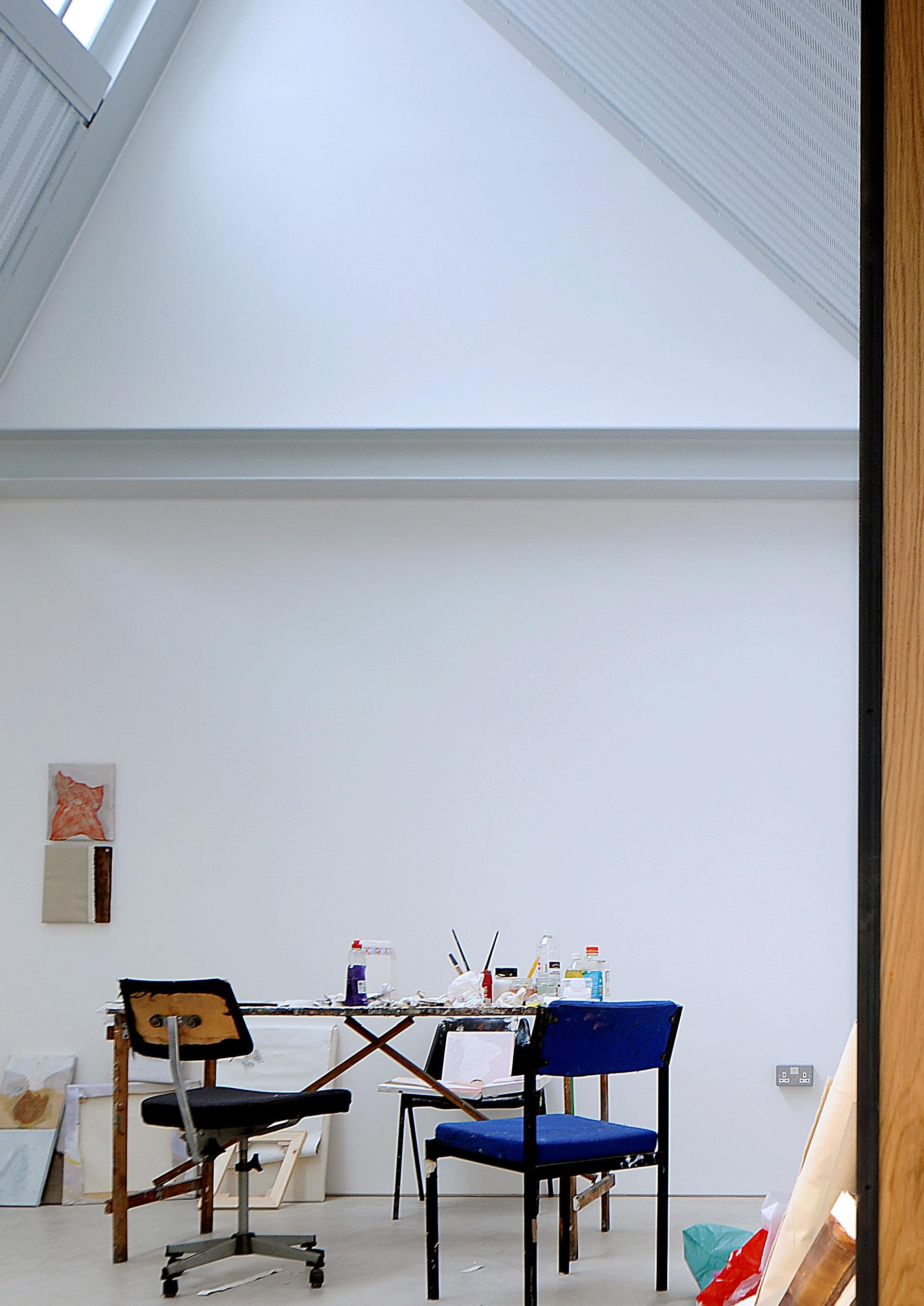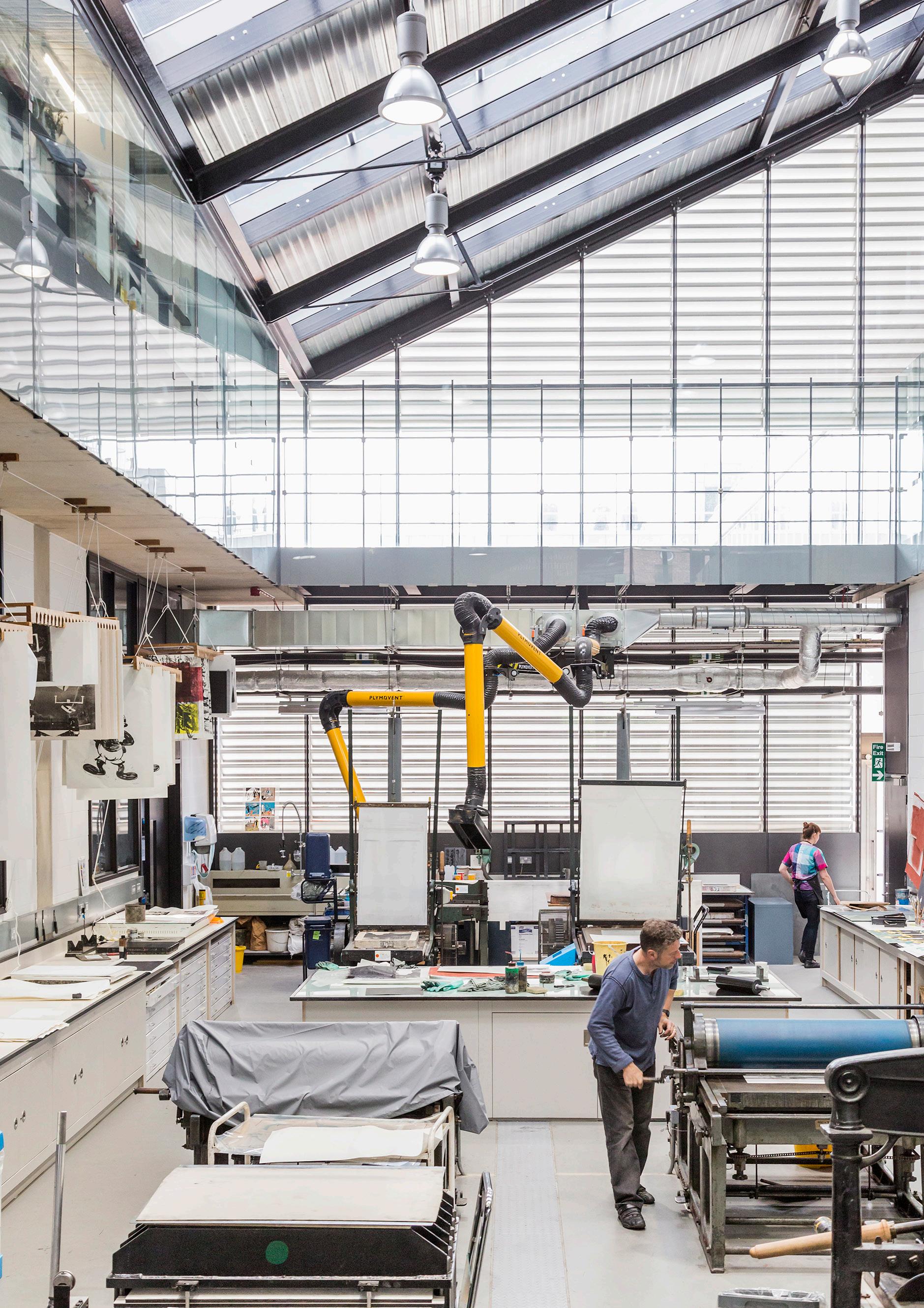 The Painting School provides purpose-built accommodation for all Painting students at the RCA, allowing them to work together under one roof for the first time in over ten years. An existing single storey factory building - has been transformed into a series of new day-lit spaces under a dramatic new roof form through the insertion of an independent steel structure within the existing brick enclosure. This significantly increased the usable height of the building, providing six double-height, top-lit studio spaces arranged off a wide central corridor space, which also serves a row of side-lit studio spaces; a galleried mezzanine floor overlooking the double-height studios provides access to an upper level of smaller top-lit studios. The main environmental design principles were that the building should be naturally ventilated and that the lighting - both natural and artificialwas optimised for painting. Lighting is provided through the northfacing roof lights and large east-facing side lights and day-lit tubes which replicate this effect. The building operates on the principle of natural ventilation based on air movement from low level windows up to the circular roof vents in the apex of each roof bay; these stay open at night in summer to enable secure night-time cooling of the space.