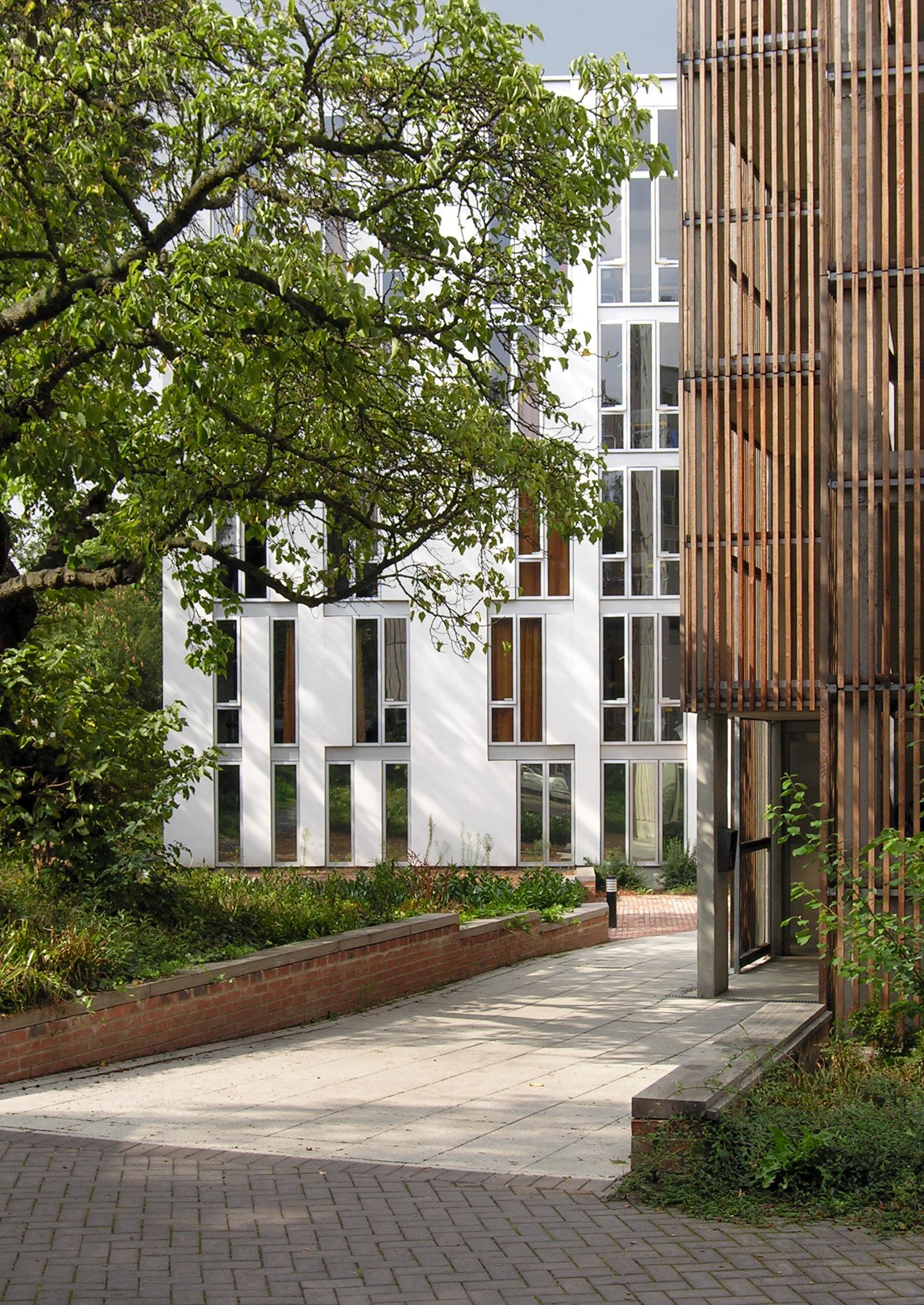 Our student accommodation at Newington Green focused on reconciling the institutional character of the project with the residential character of the area, whilst providing an appropriate social scale for the residential accommodation. Comprised of four pavilion buildings, each cluster contains its own stair and lift, which lead onto screen galleries open to the air but protected from rain by timber screens and planted mesh trellising.