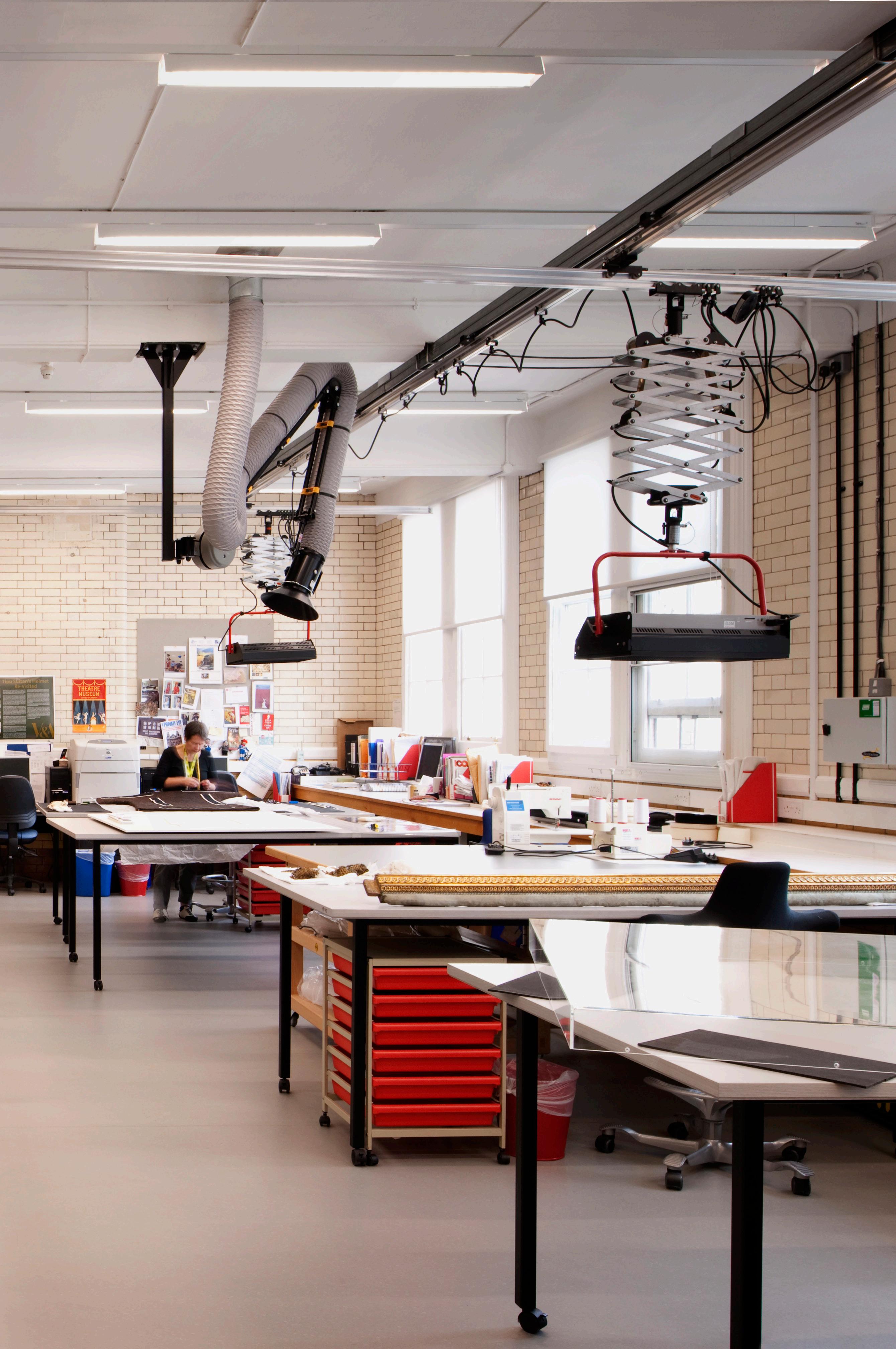 We have experience designing very specialist technical workshops for a range of educational and cultural institutions. These facilities demonstrate our ability to work through the briefing, design and planning of these spaces, as well as incorporate complex servicing requirements. Workshop spaces were fundamental to the buildings at the RCA Battersea campus. The design of the Clore Innovation Centre in the Dyson building helps facilitate a link between business and education by providing an ecosystem of creative workspaces linked to workshops, with the mission to strengthen the culture of design innovation and entrepreneurialism at the University and explore new and innovative ways of working. The Woo Building mirrors the factory-inspired Dyson Building, with a triple-height glazed central hall accommodating specialist equipment alongside spacious workshops. Through working in close collaboration with academics, technicians and students we were able to build an in-depth understanding of the requirements for the workshops and develop a space planning strategy for these facilities that was well coordinated with efficient servicing. The refurbishment and extension of Kingston University Knights Park campus will deliver state of the art, highly serviced workshop spaces. These include dedicated 3D workshops, printmaking and letterpress workshops, photography and film studios, darkrooms, digital editing suites, rapid prototyping facilities and animation and motion capture studios. Early end-use engagement with a range of different art, design and humanities departments helped to assess needs and develop the brief. Close collaboration with the estates team and facilities management helped to ensure design decisions deliver maximum value for money whilst meeting the requirements of end users.
