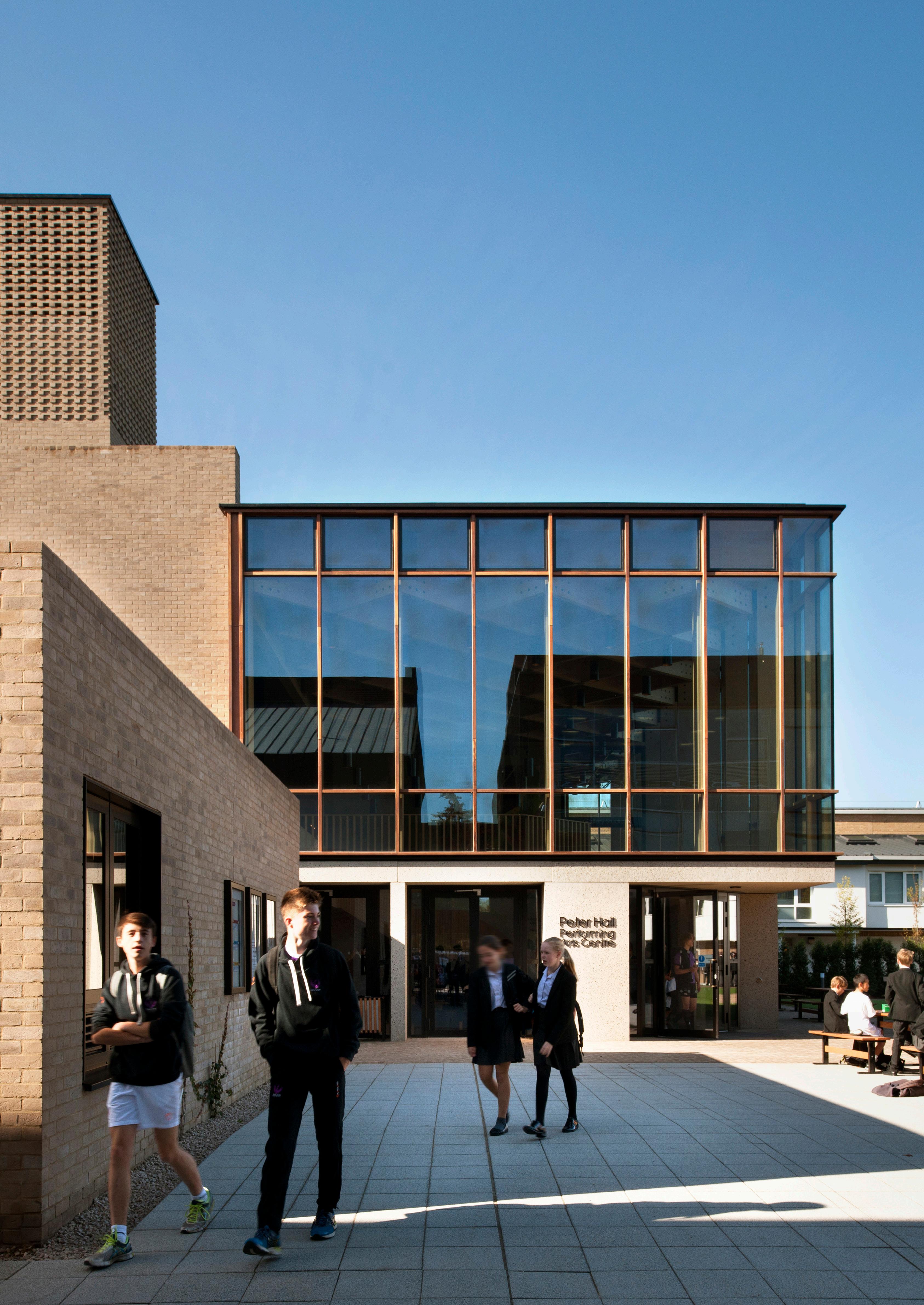 There is a 300-400-seat auditorium at the new Peter Hall Performing Arts Centre for The Perse School in Cambridge alongside an adaptable lobby space that incorporates a large, daylit rehearsal and teaching room, an exhibition space and full back of house dressing rooms, workshop and ancillary spaces, along with a suite of five classrooms.