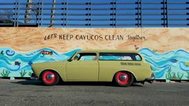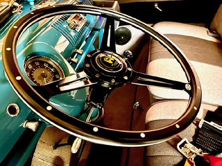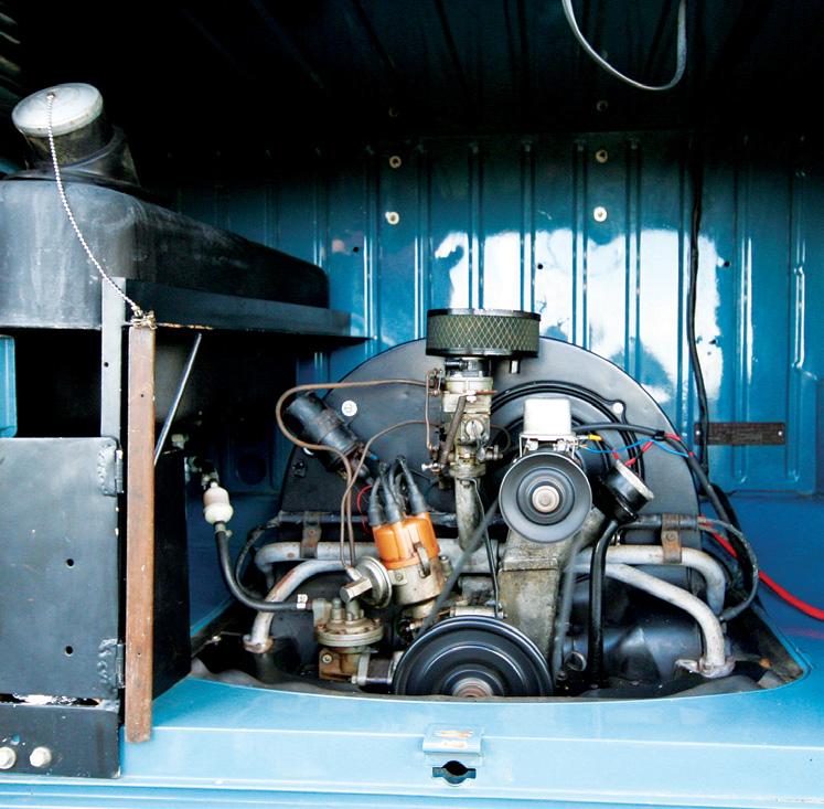 tank and compressor covers in the green and the grey suede air tank trim. All clocks and dials are refurbed to pristine condition by Auto Clock. One thing that does stand out with the interior is that the only part on the whole car not restored is the steering wheel. This is because, as Ben says, “I love the history in cars and because I couldn’t keep the original paint I felt not restoring the steering wheel would keep some of the history.” The engine was rebuilt using NOS parts and rebuilt Super 90 carbs in the engine