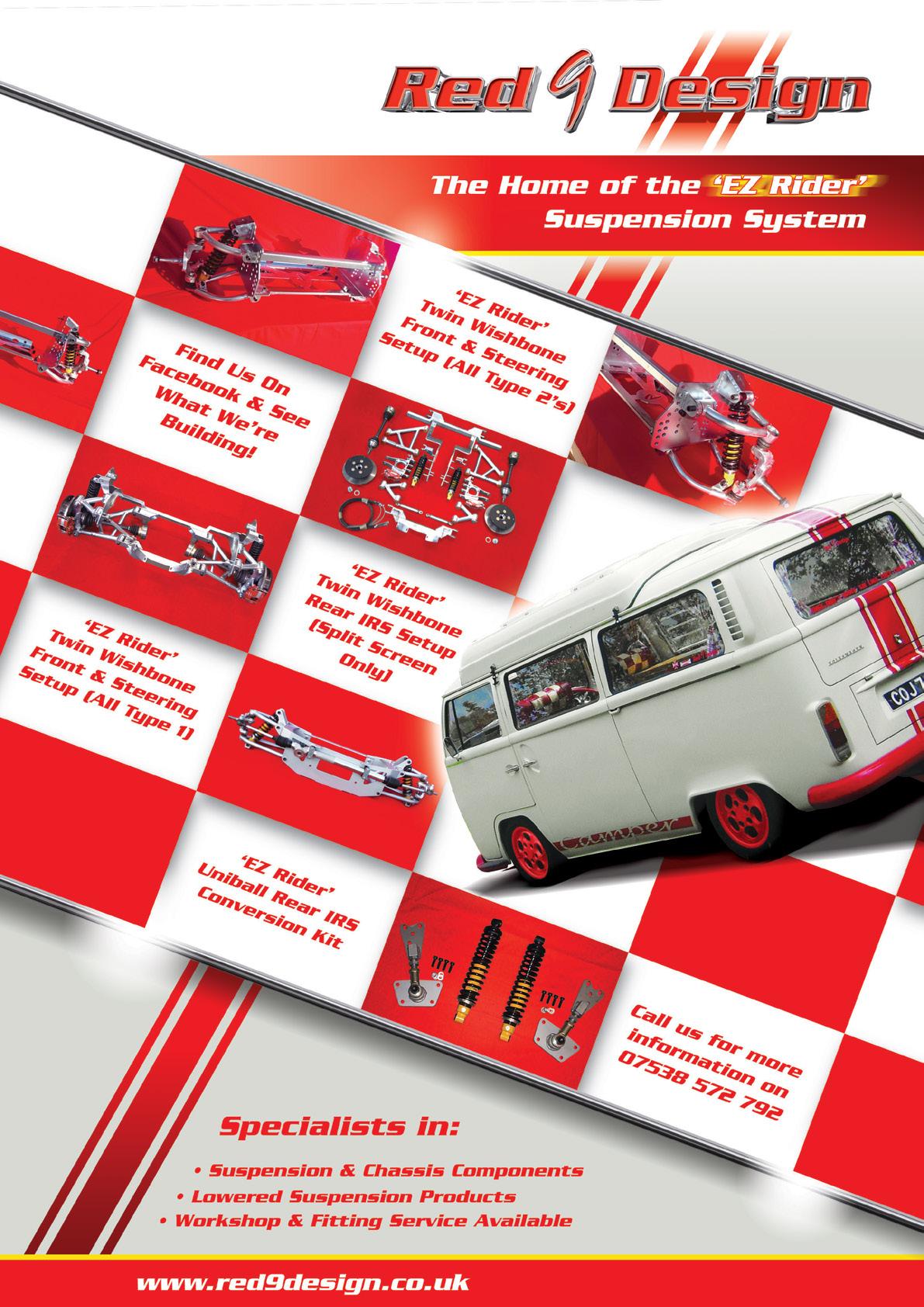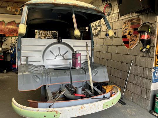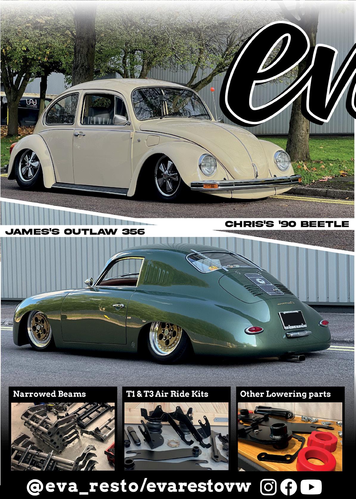 time. Ben explains, “with it being a genuine 356 we couldn’t just use off the shelf Beetle parts to achieve this”. He started off with a complete generic air suspension lowering kit for the rear, and IRV’s Restorations (www.irvsvwrestoration. co.uk) modified that to suit along with a set of front air shocks. “I went to inspect the build before paint. The ride height didn’t feel right, so there and then we cut the rear chassis to achieve the desired height. This in itself was a little mad because all the metal work was complete at this stage. However, you have to do what you have to do when you have a picture in your head. We also chopped the front spare wheel tray out to achieve the desired height.”