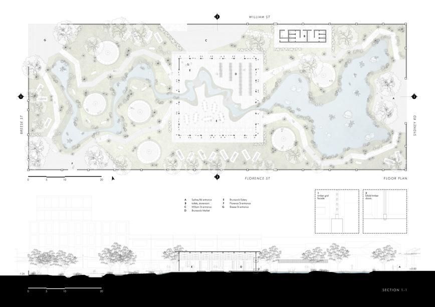 Bringing back the past and natural elements and adding Brunswick’s current context, ReImagining Merri Creek is a public urban nature space with market and social spaces for Brunswick people. Acts as a space to breathe, the waters resembles the Merri Creek, the trees and timbers resembles how trees are used for shelters, and modern materials such as concrete, bricks, steel, and aluminium resembles Brunswick’s industrial identity.