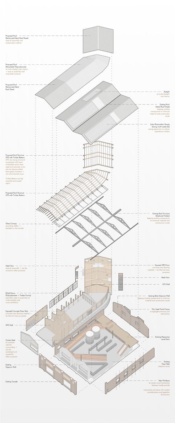 Following the zero-waste trend, the proposed design adopts adaptivereuse on the existing heritage building and design for disassembly for the new building with considerations on using recyclable and low-embodied carbon materials.