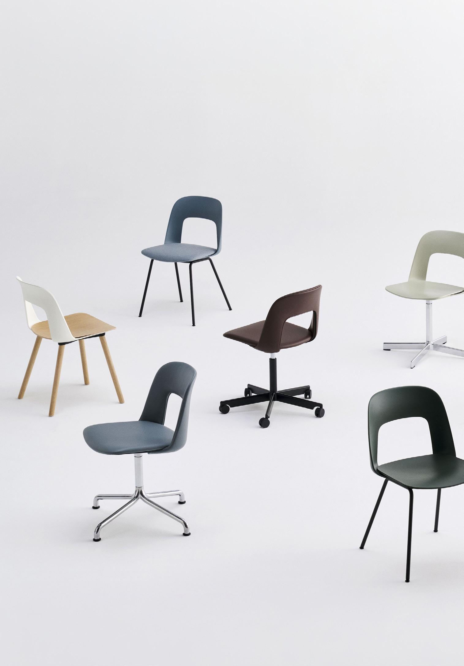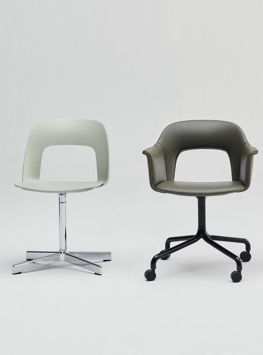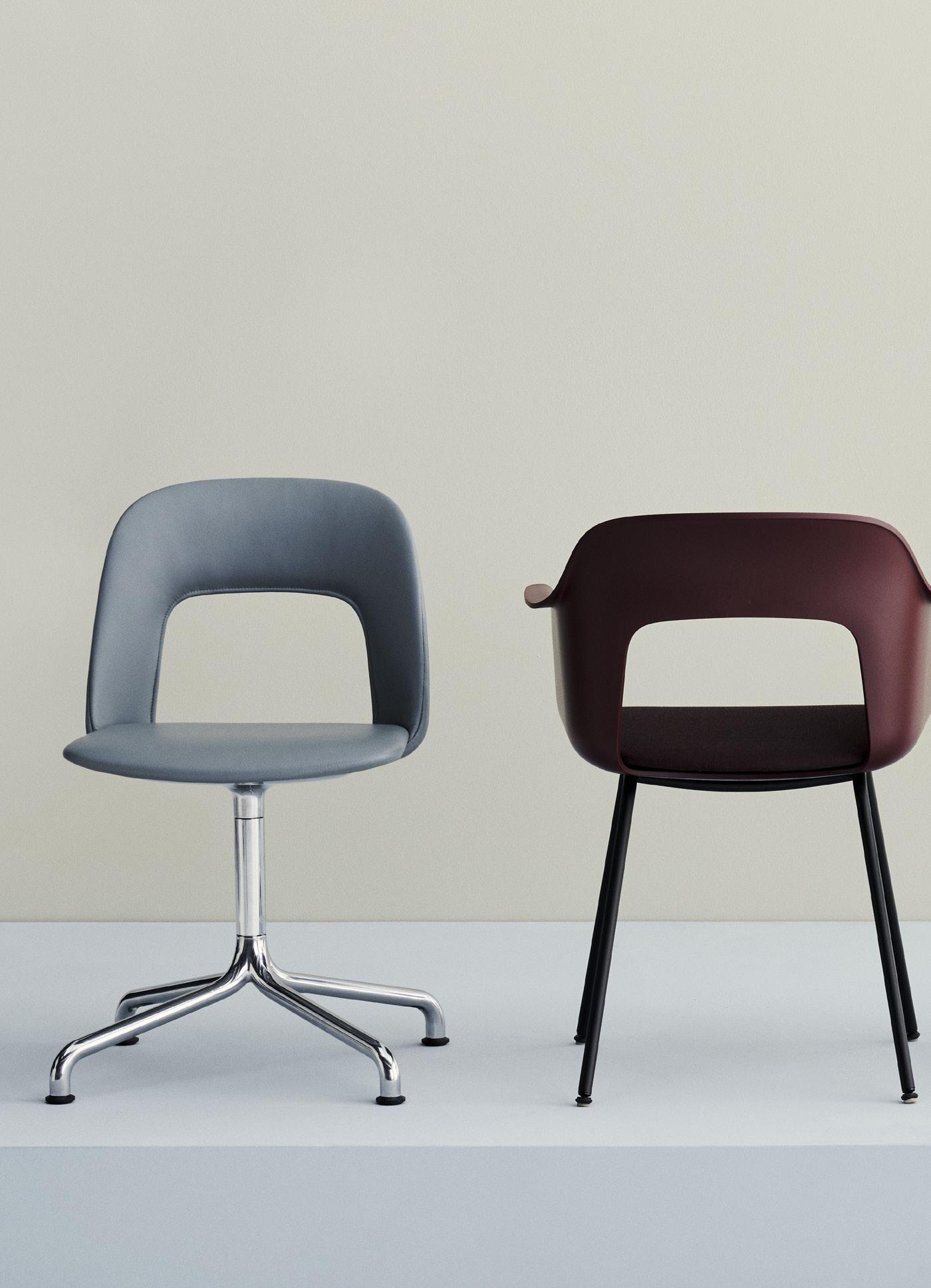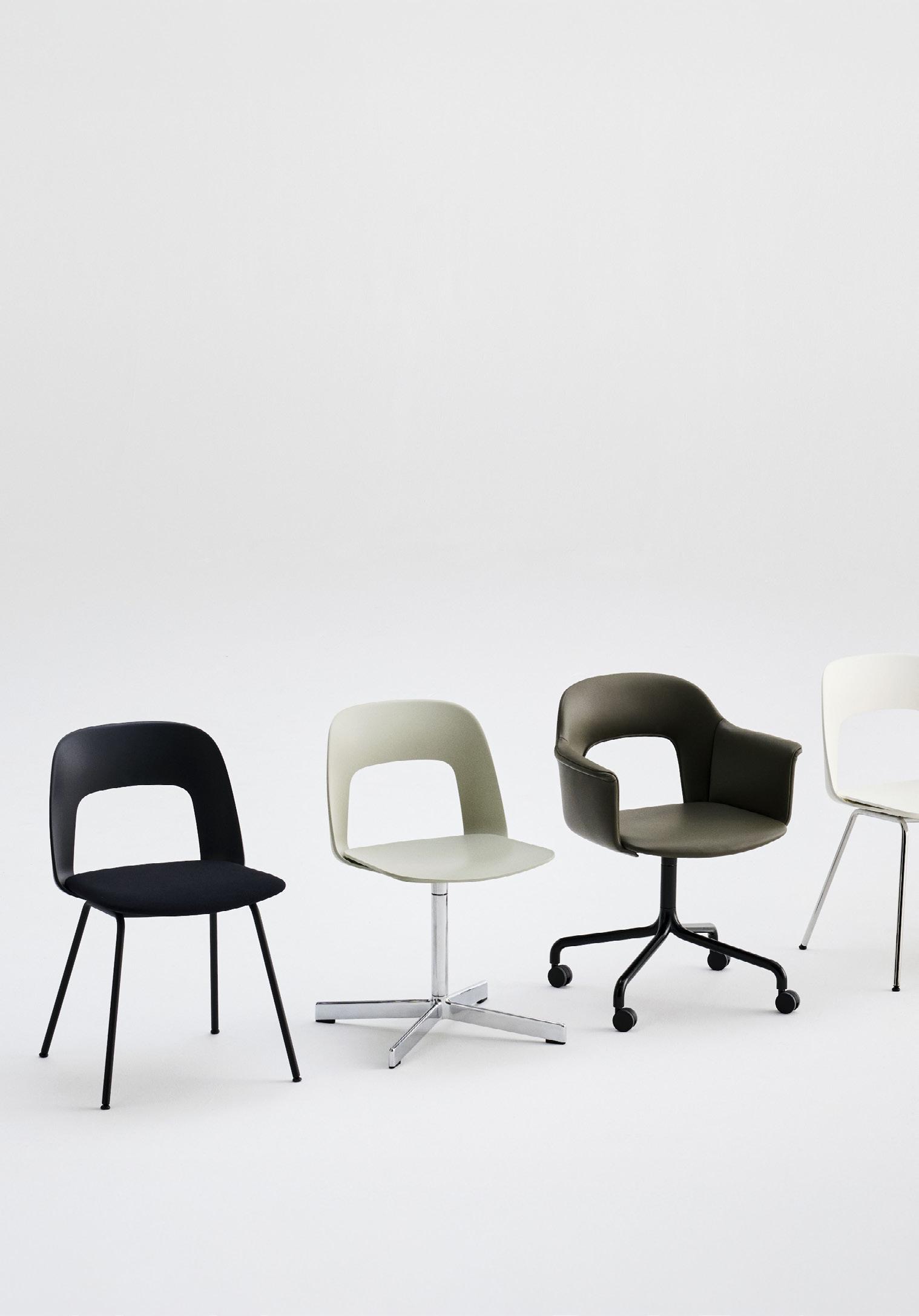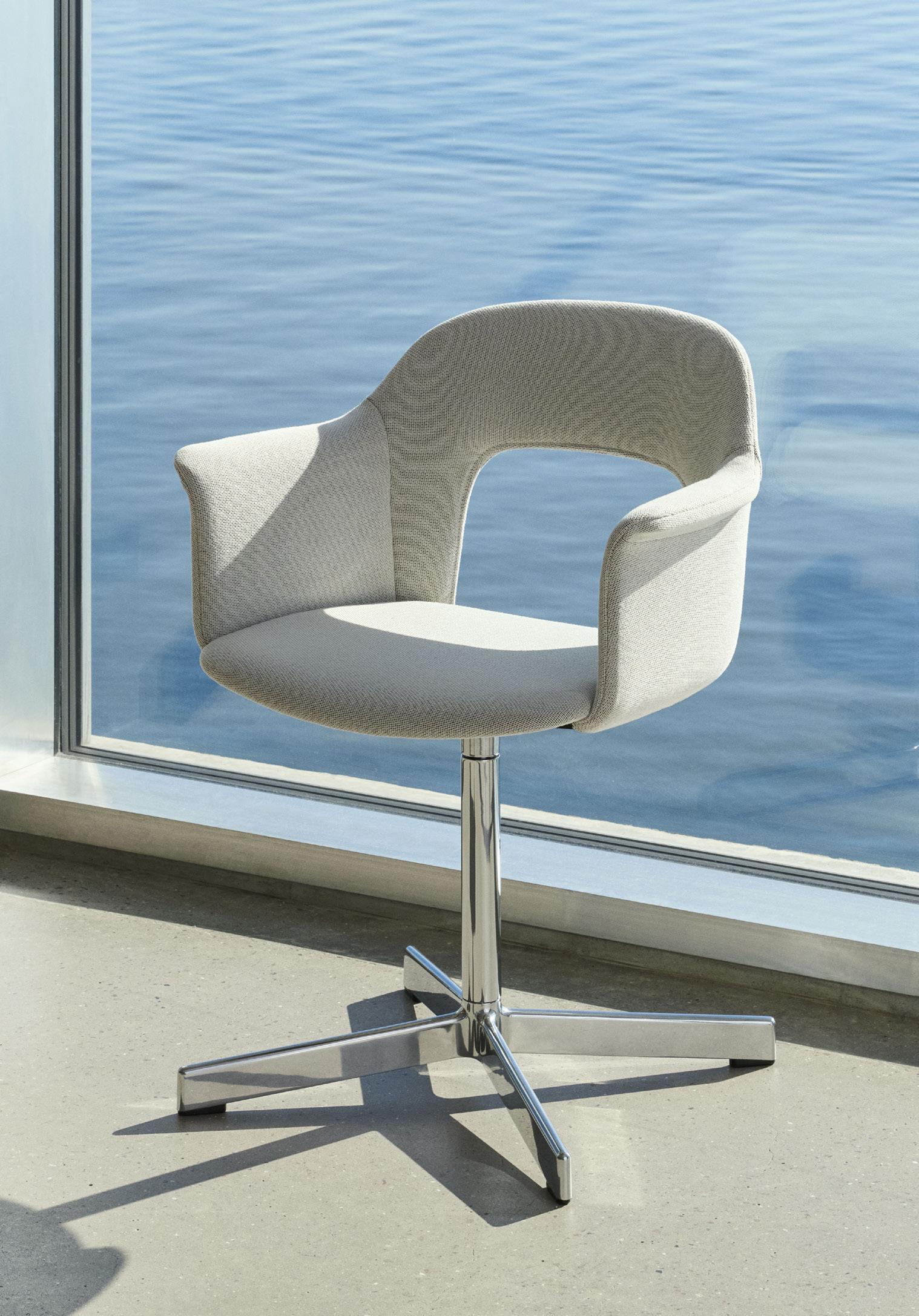Defined by the opening in the backrest, the armchair has a light, transparent expression, while the integrated armrests provide added comfort and support. Generous yet versatile, it is well suited to meeting rooms, workspaces, and hospitality environments.
