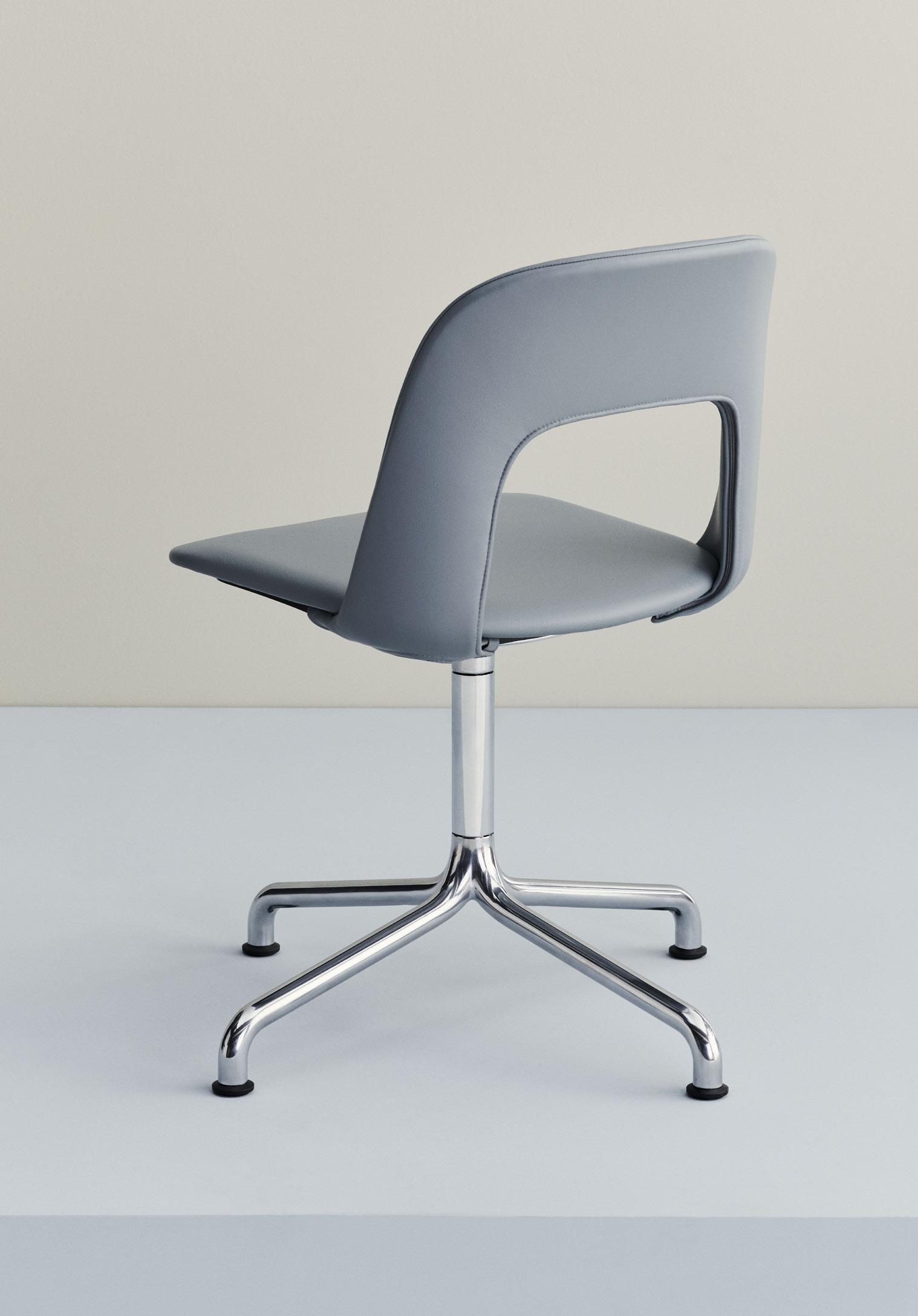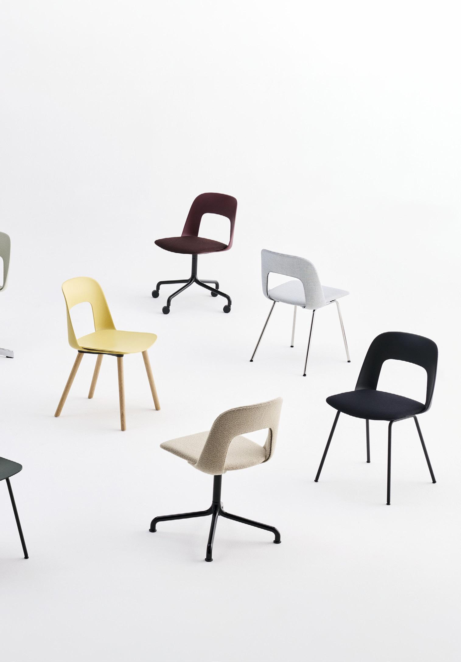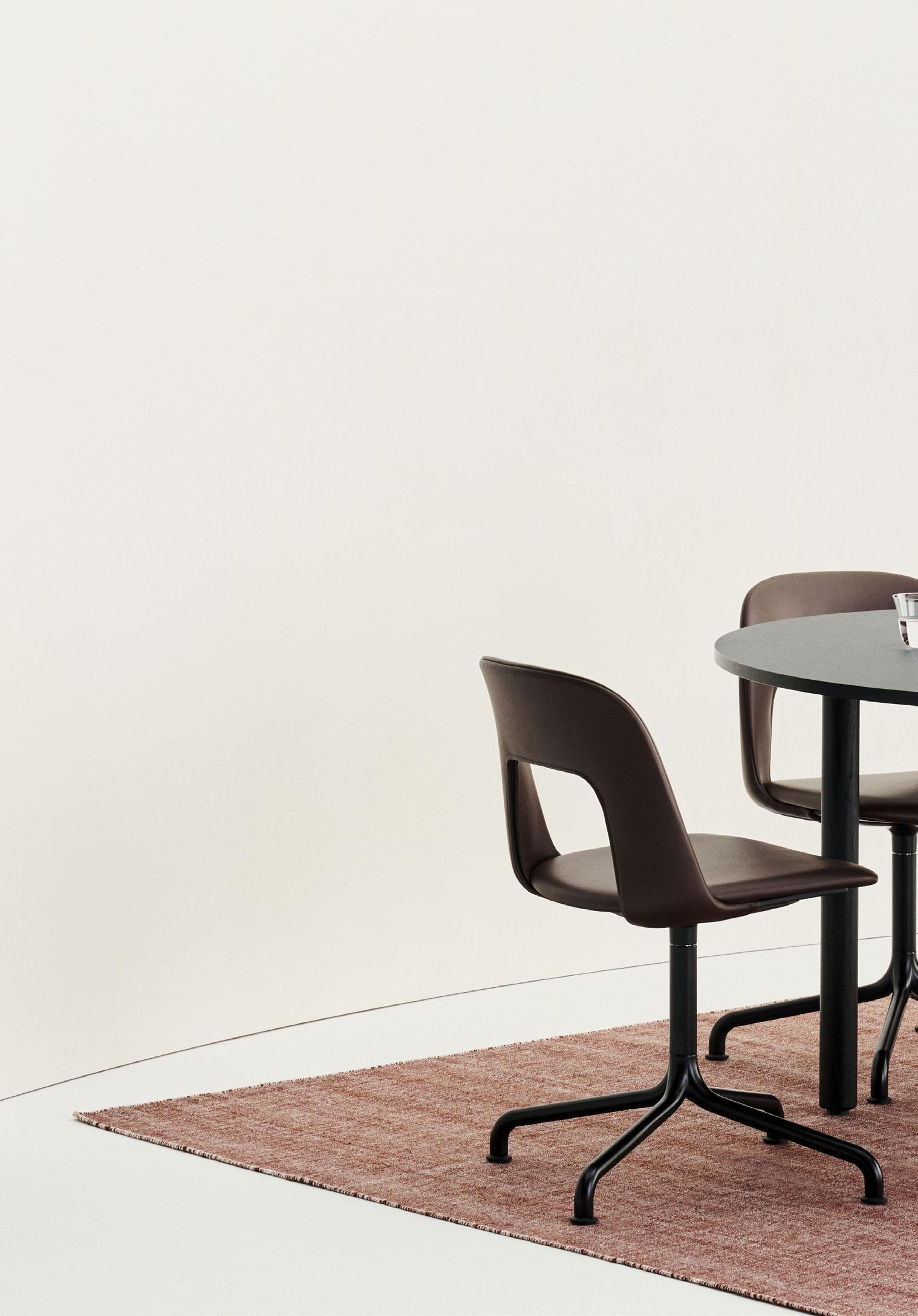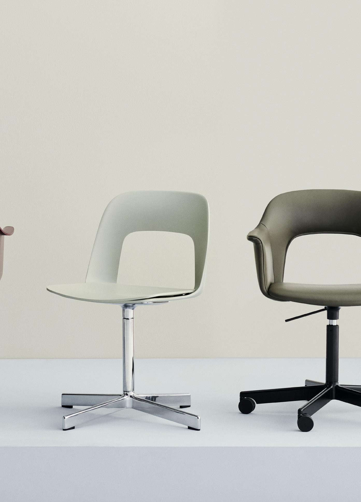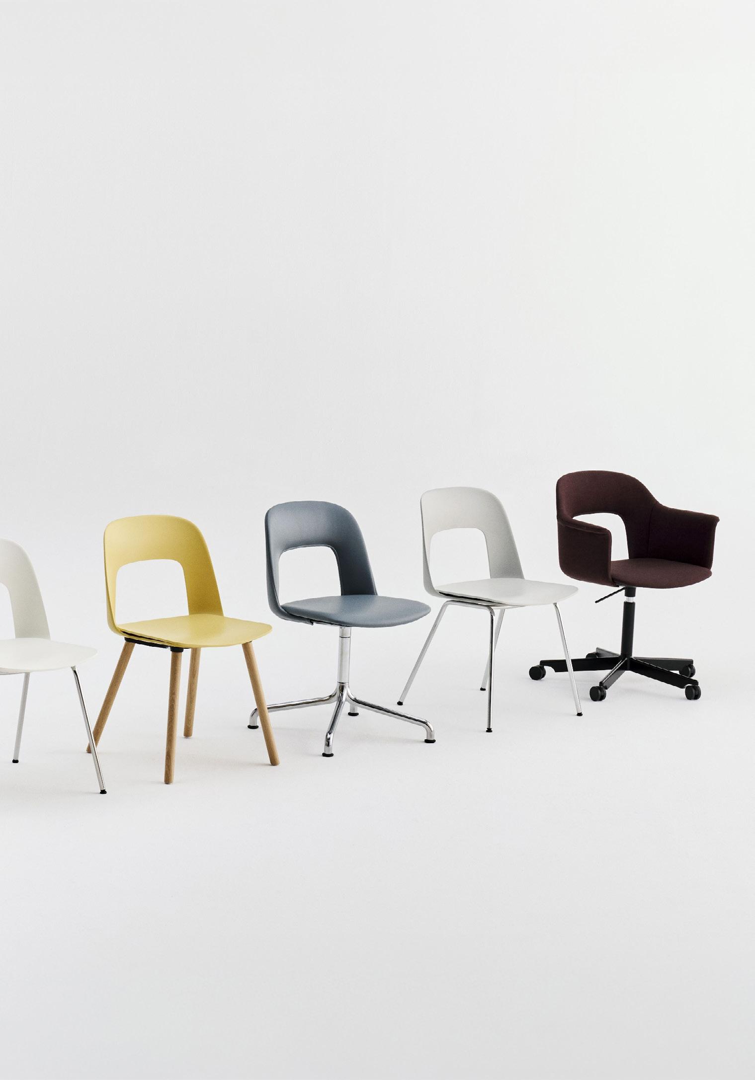 Defined by the opening in the backrest, the armchair has a light, transparent expression, while the integrated armrests provide added comfort and support. Generous yet versatile, it is well suited to meeting rooms, workspaces, and hospitality environments.