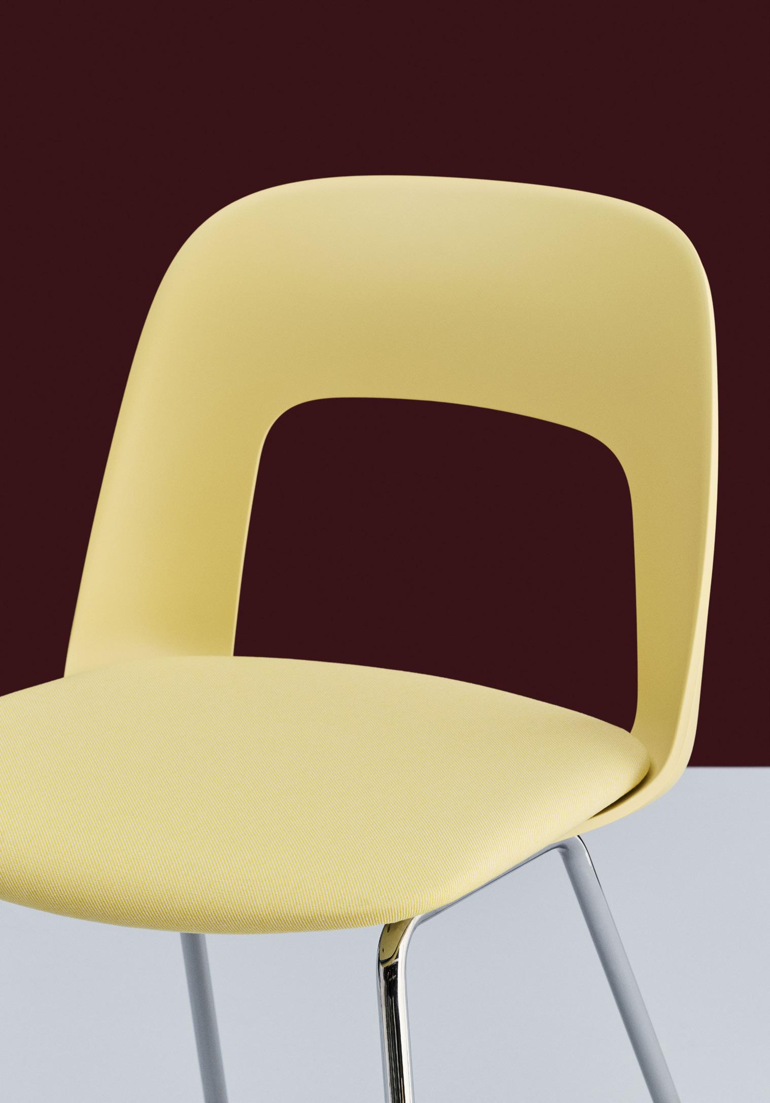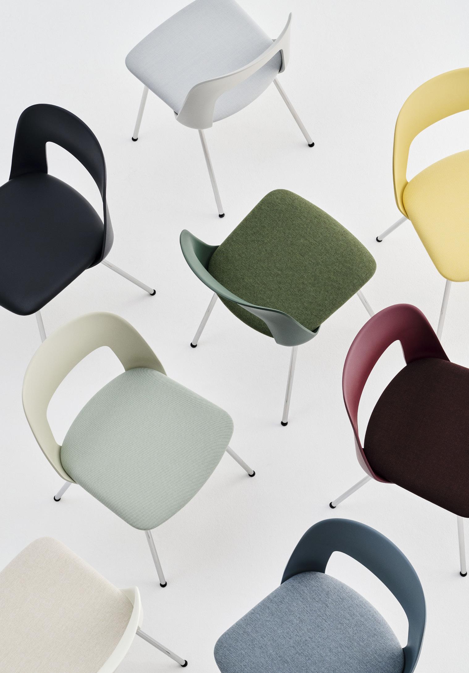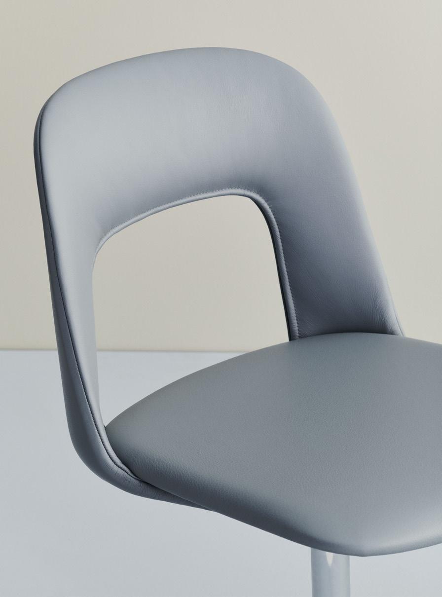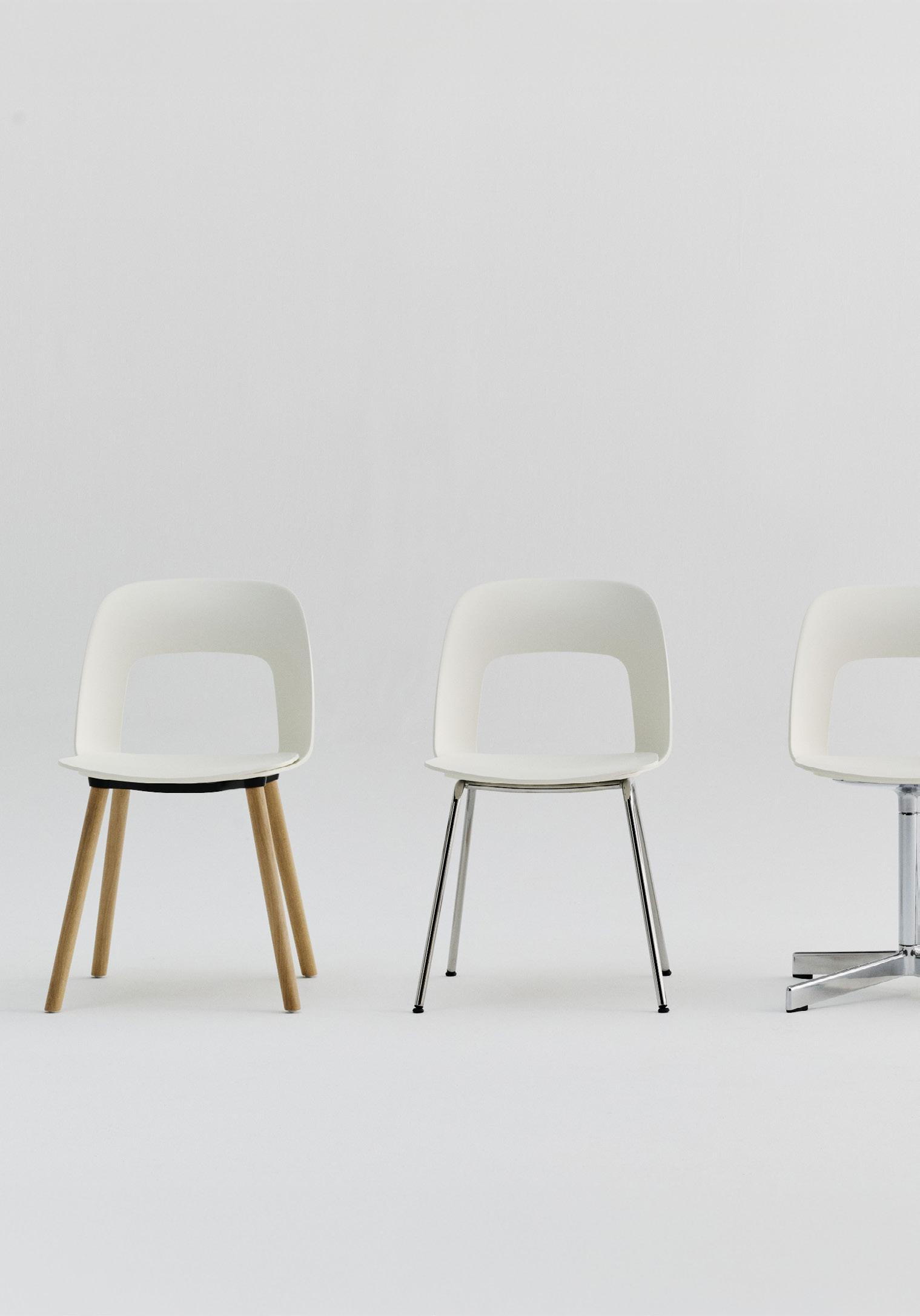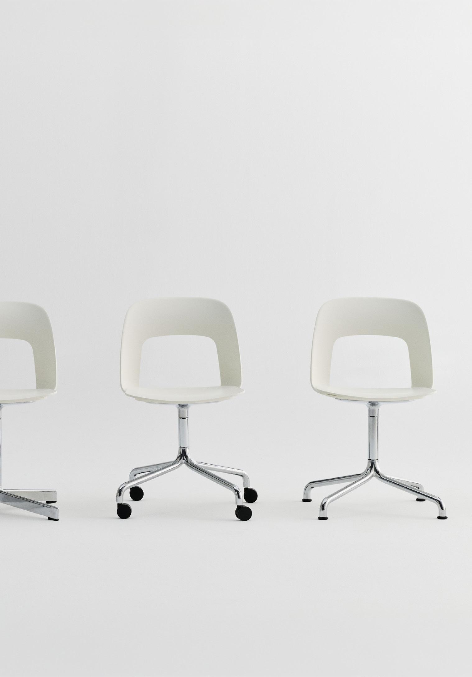 Defined by the opening in the backrest, the armchair has a light, transparent expression, while the integrated armrests provide added comfort and support. Generous yet versatile, it is well suited to meeting rooms, workspaces, and hospitality environments.
