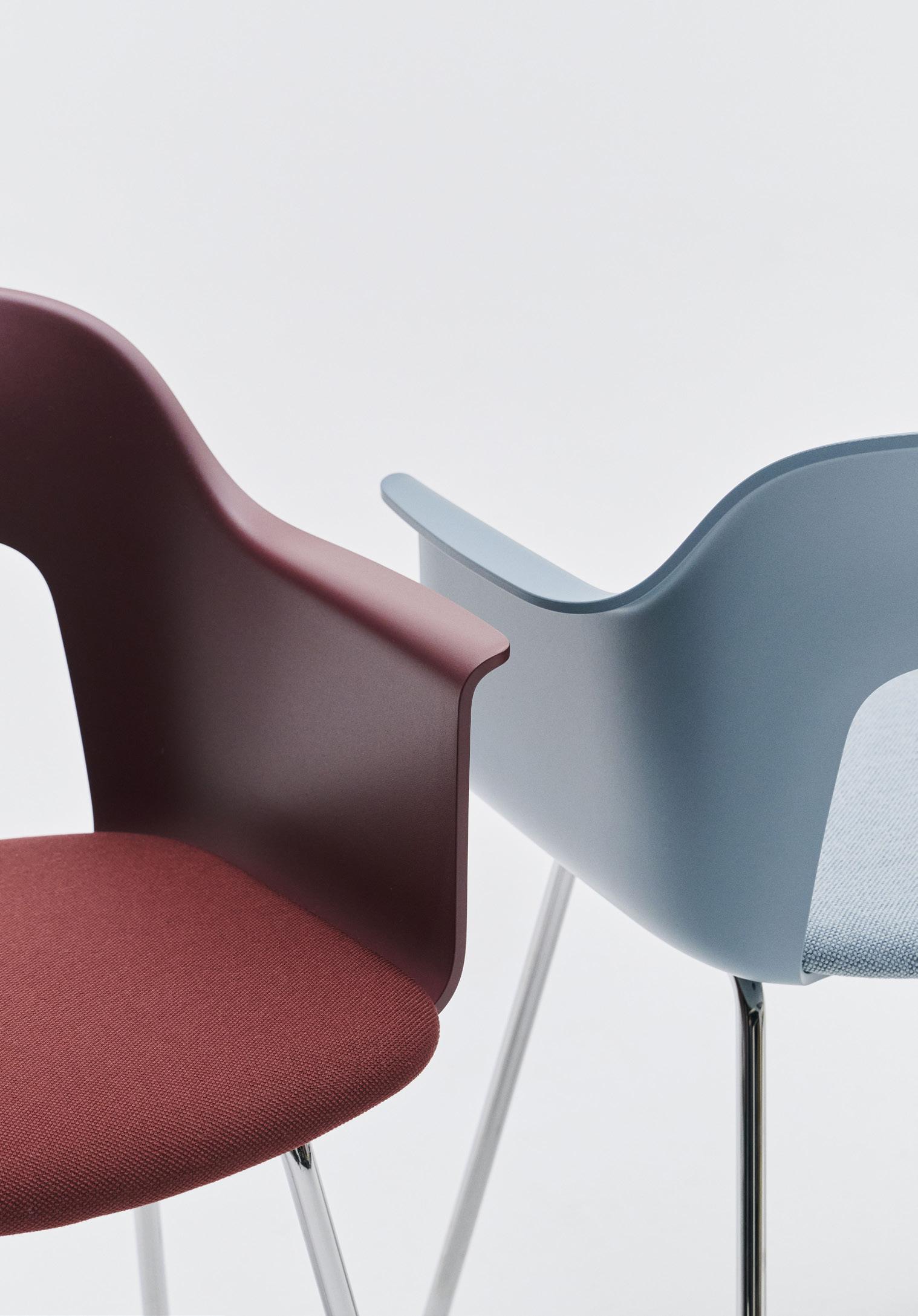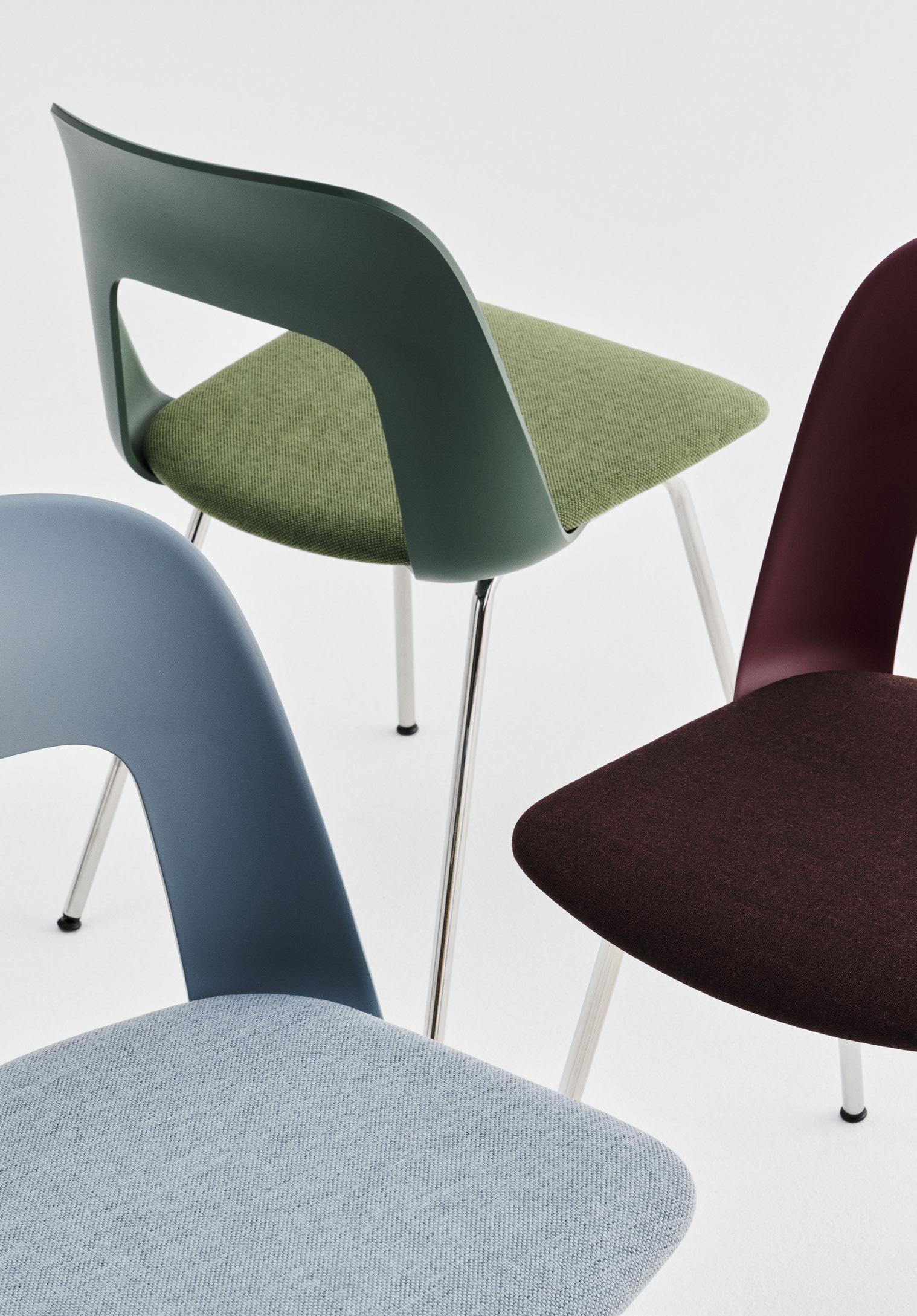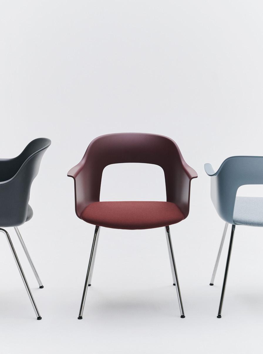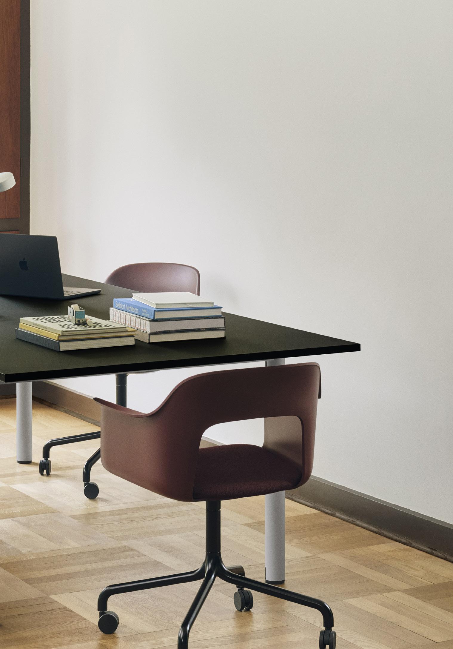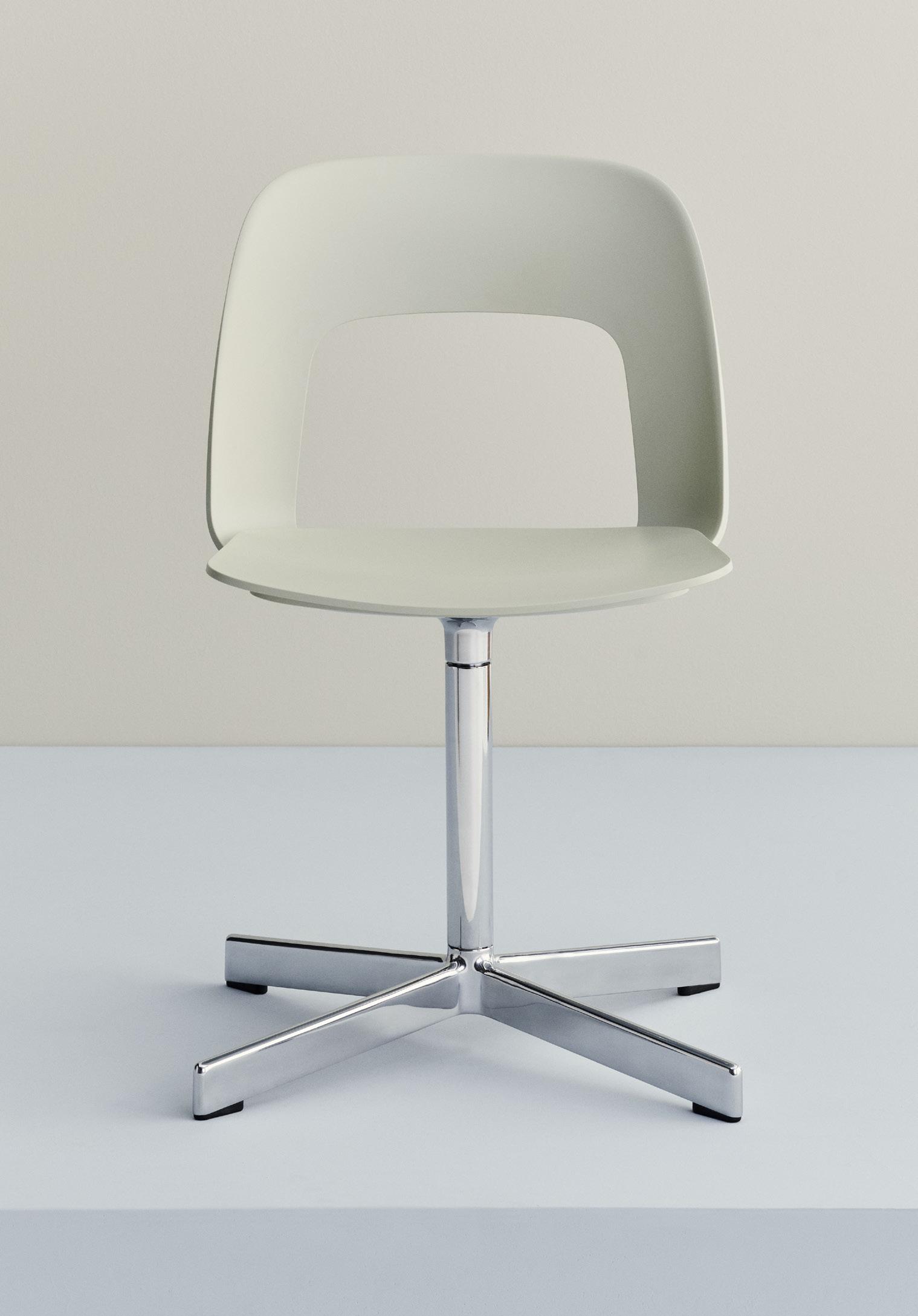 Defined by the opening in the backrest, the armchair has a light, transparent expression, while the integrated armrests provide added comfort and support. Generous yet versatile, it is well suited to meeting rooms, workspaces, and hospitality environments.