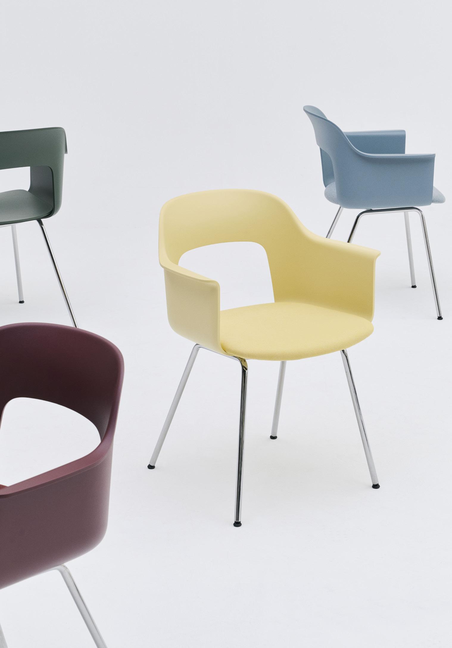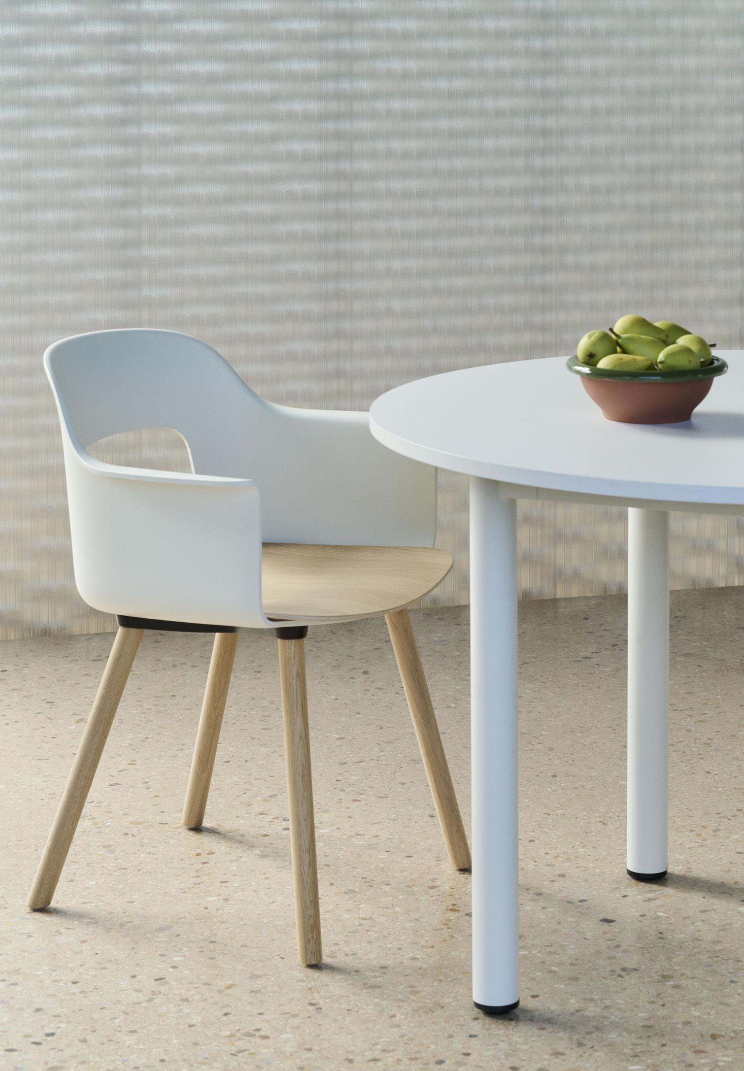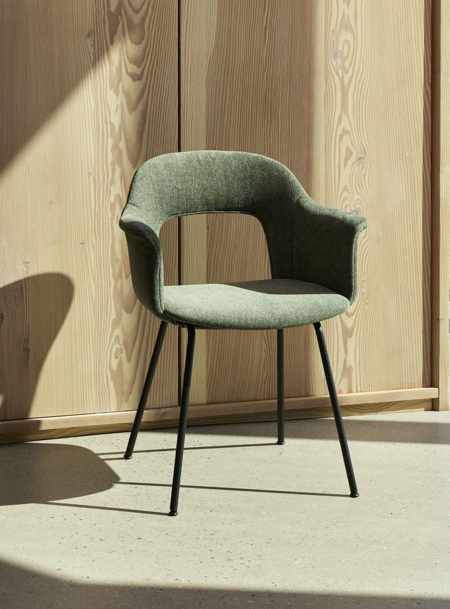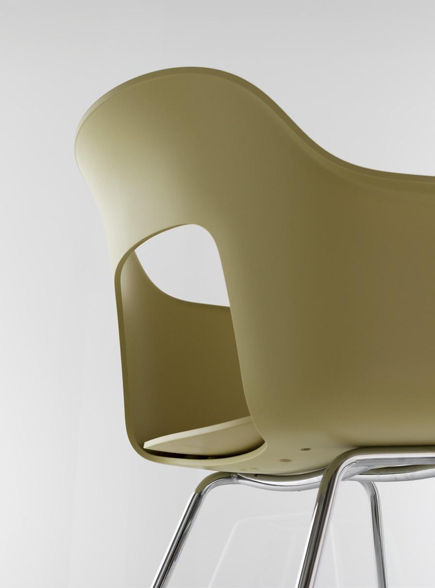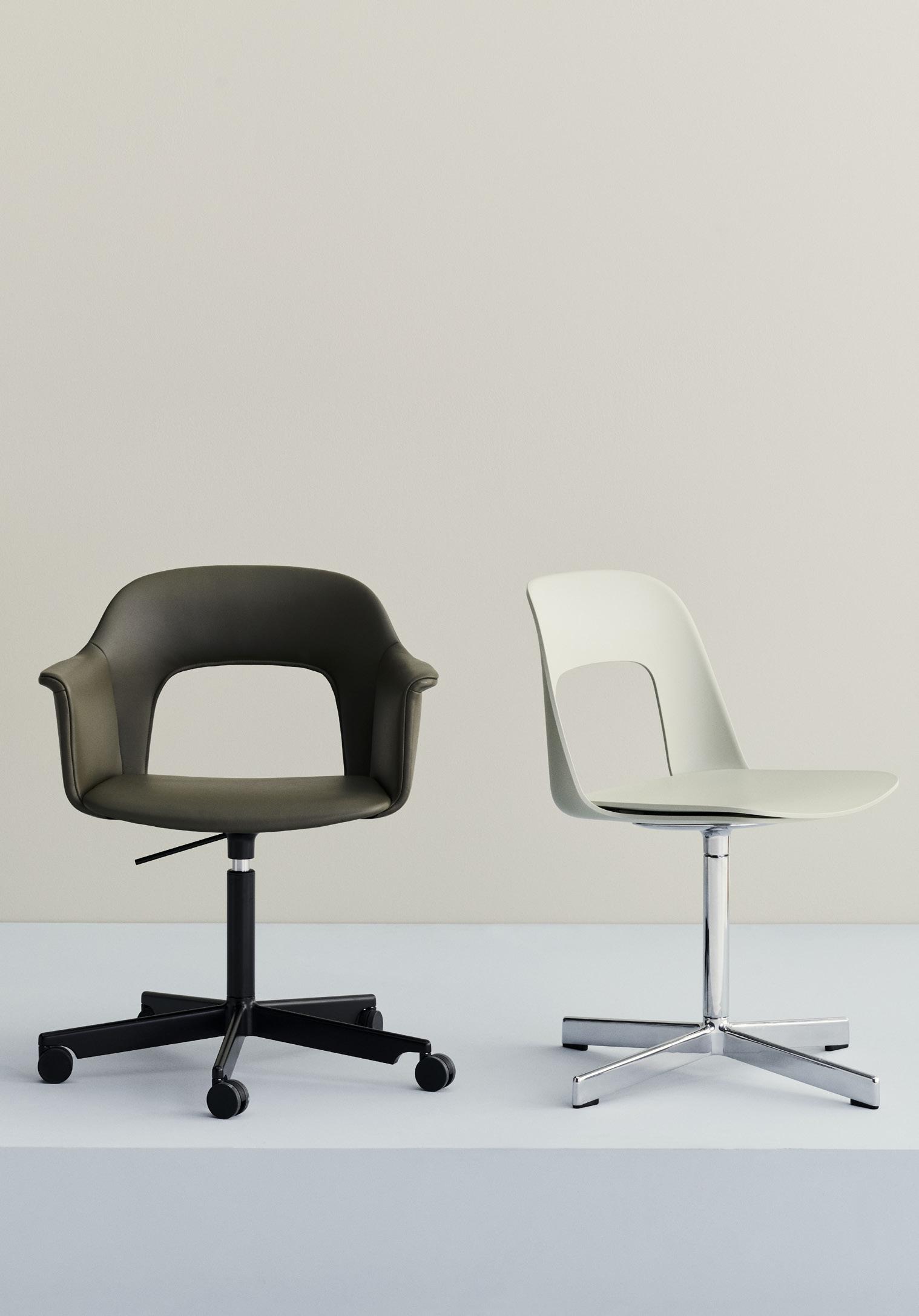 Defined by the opening in the backrest, the armchair has a light, transparent expression, while the integrated armrests provide added comfort and support. Generous yet versatile, it is well suited to meeting rooms, workspaces, and hospitality environments.