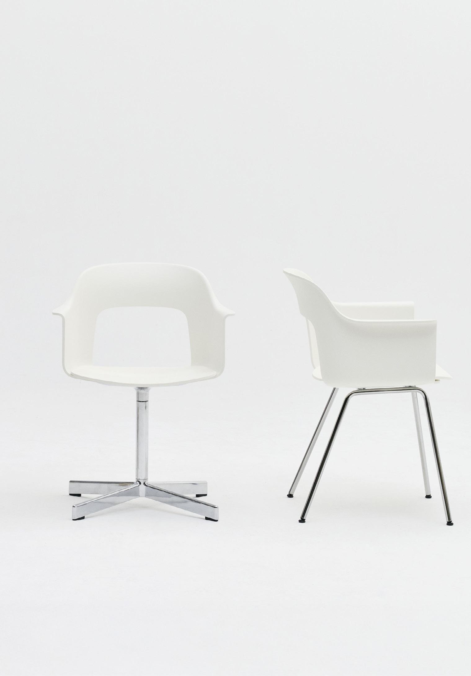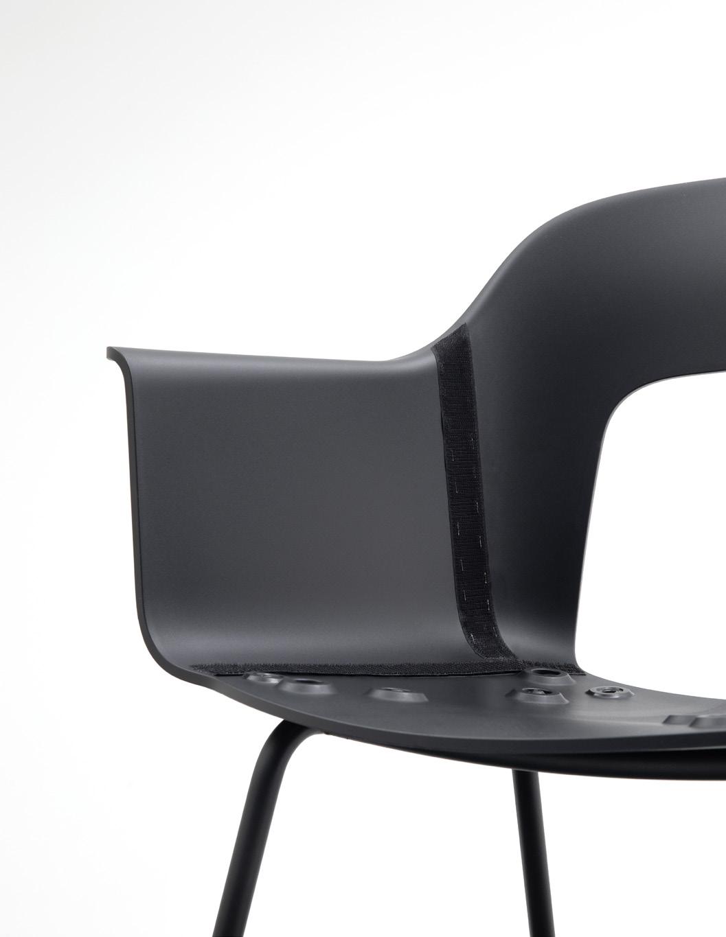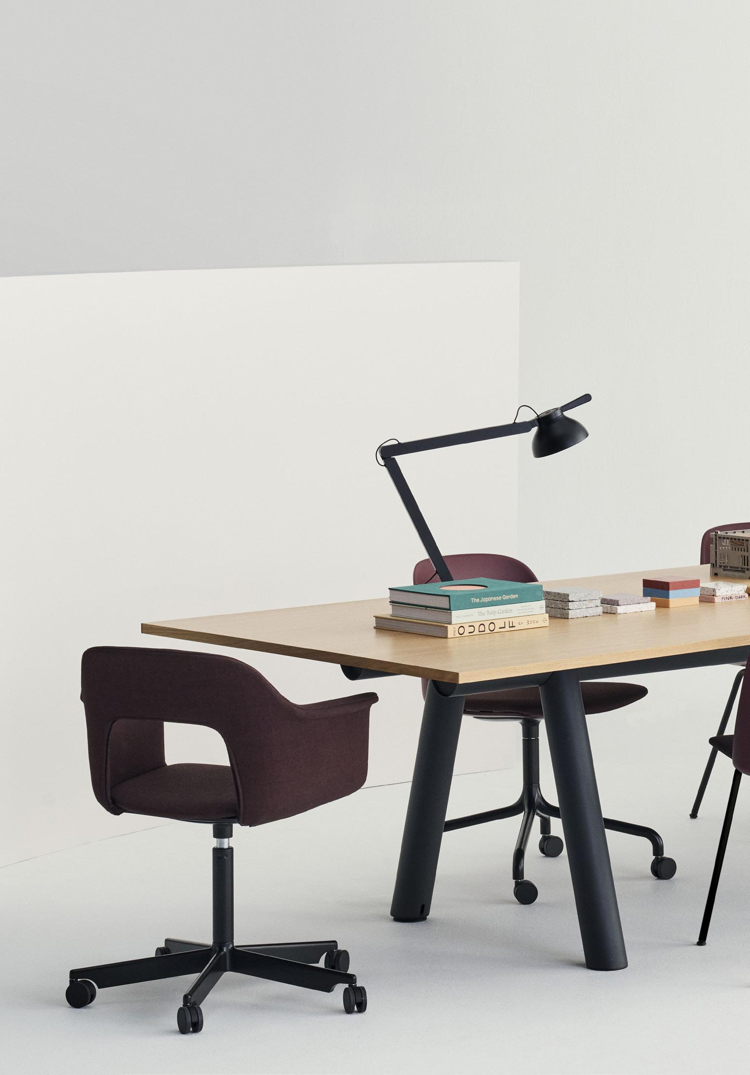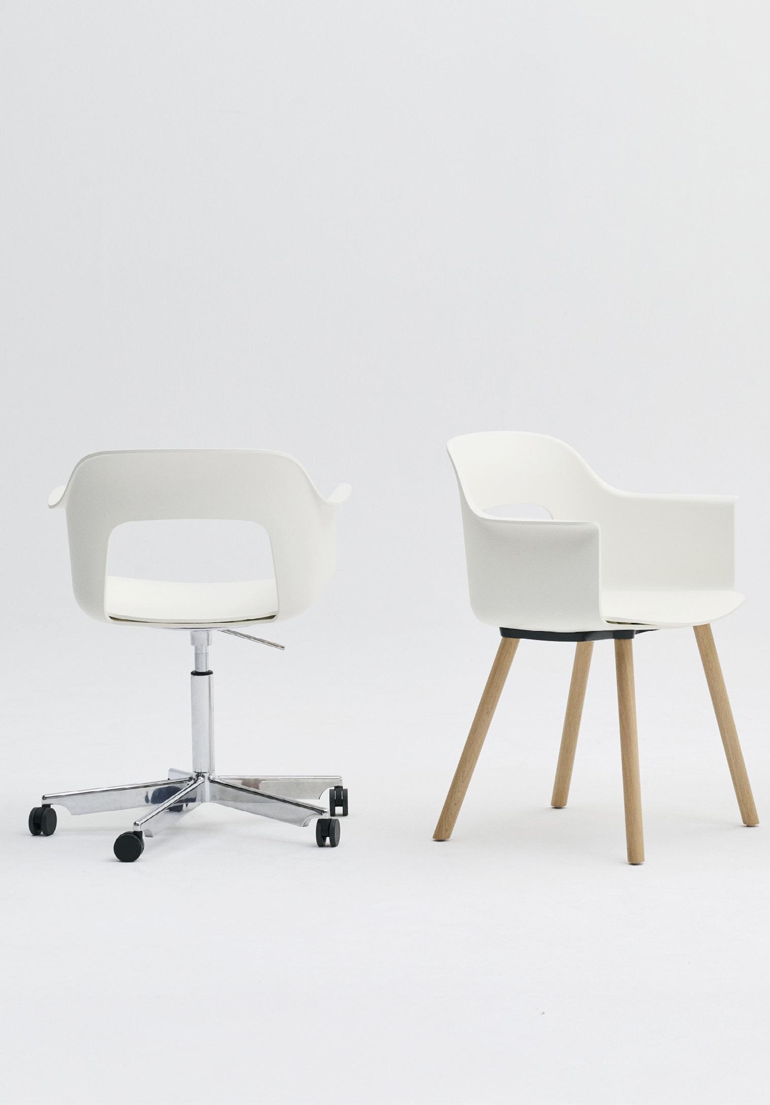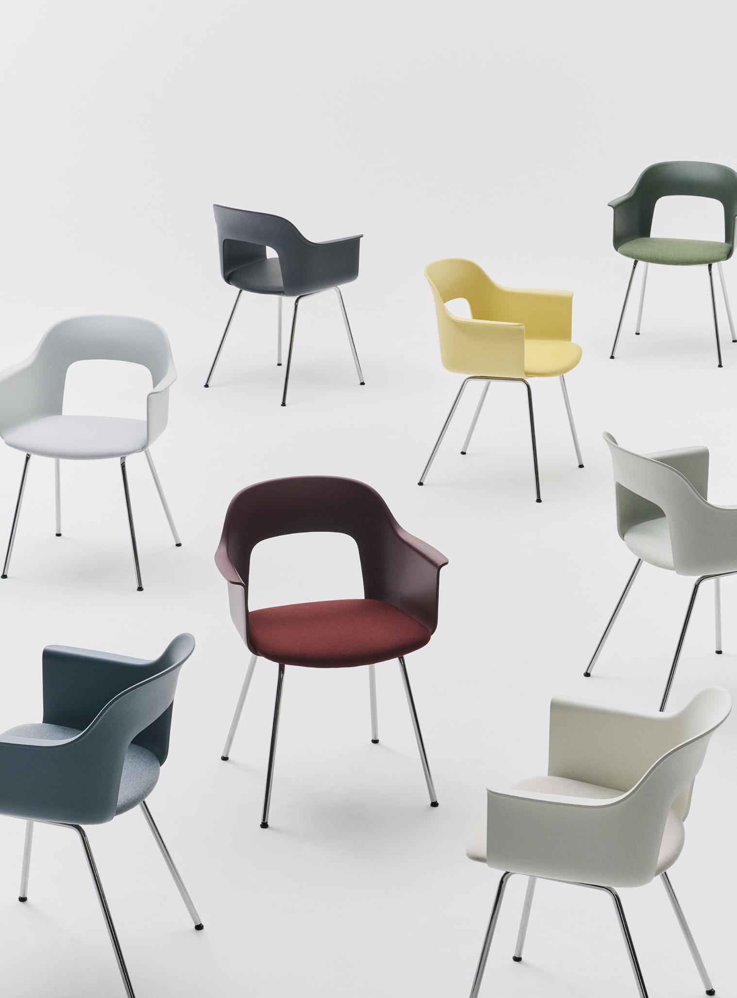 Defined by the opening in the backrest, the armchair has a light, transparent expression, while the integrated armrests provide added comfort and support. Generous yet versatile, it is well suited to meeting rooms, workspaces, and hospitality environments.