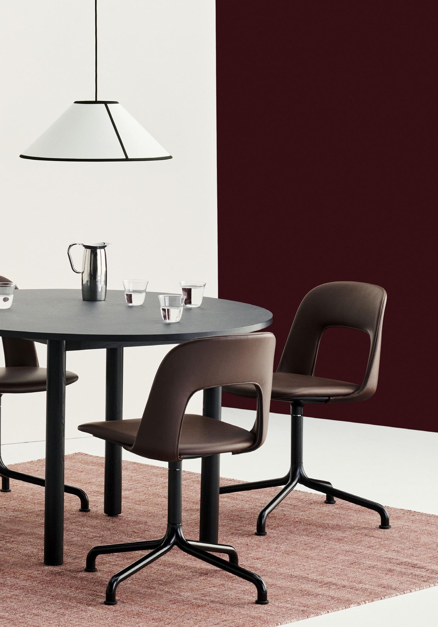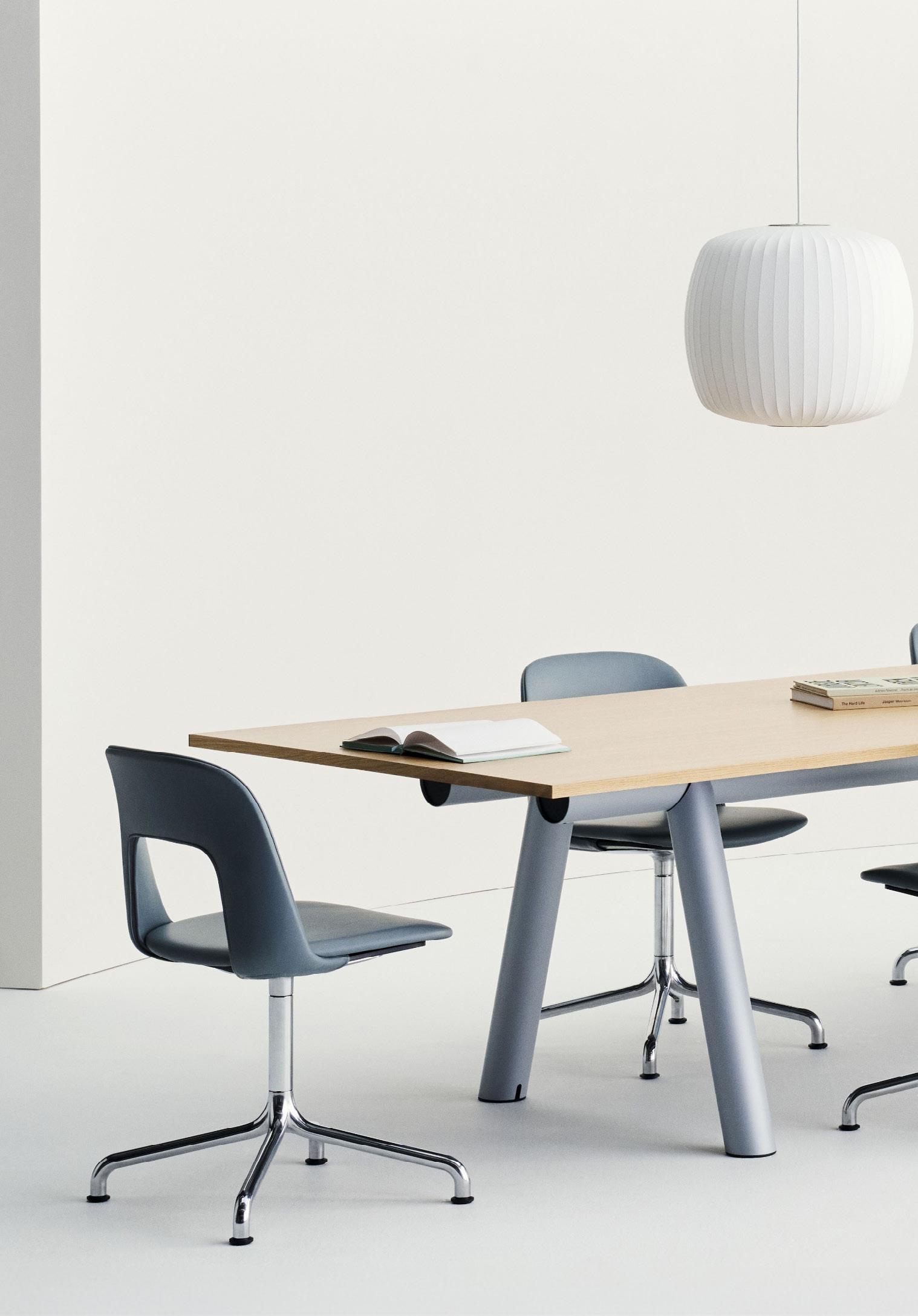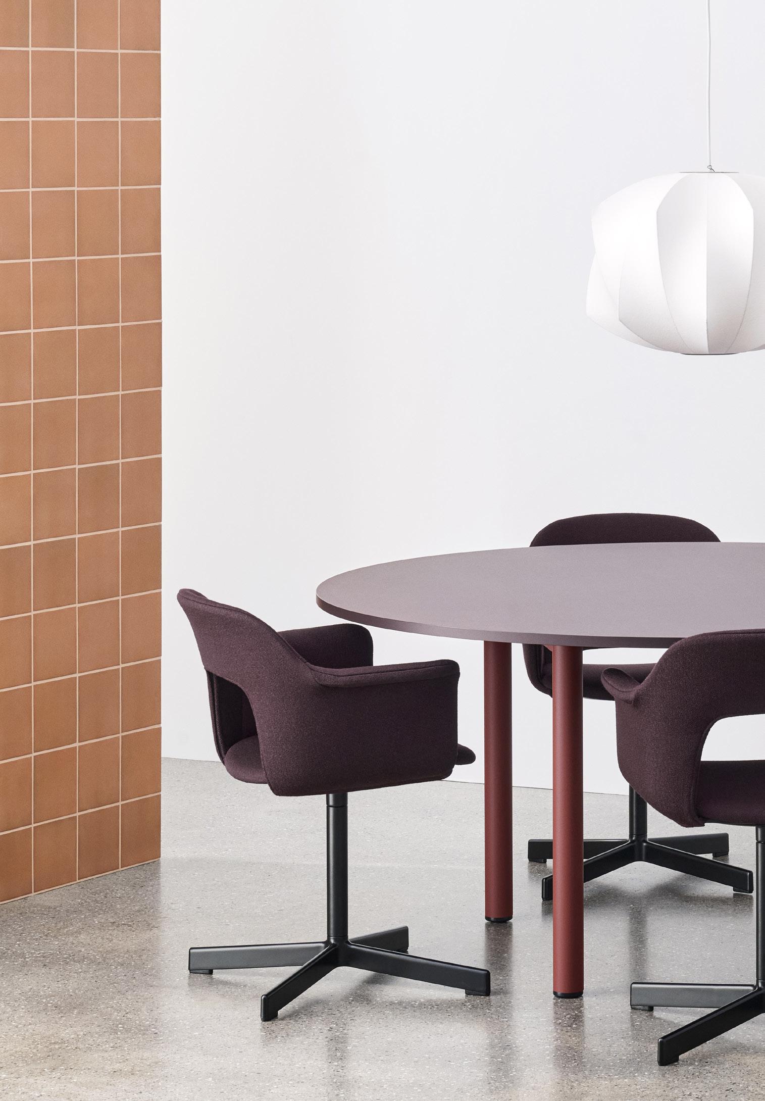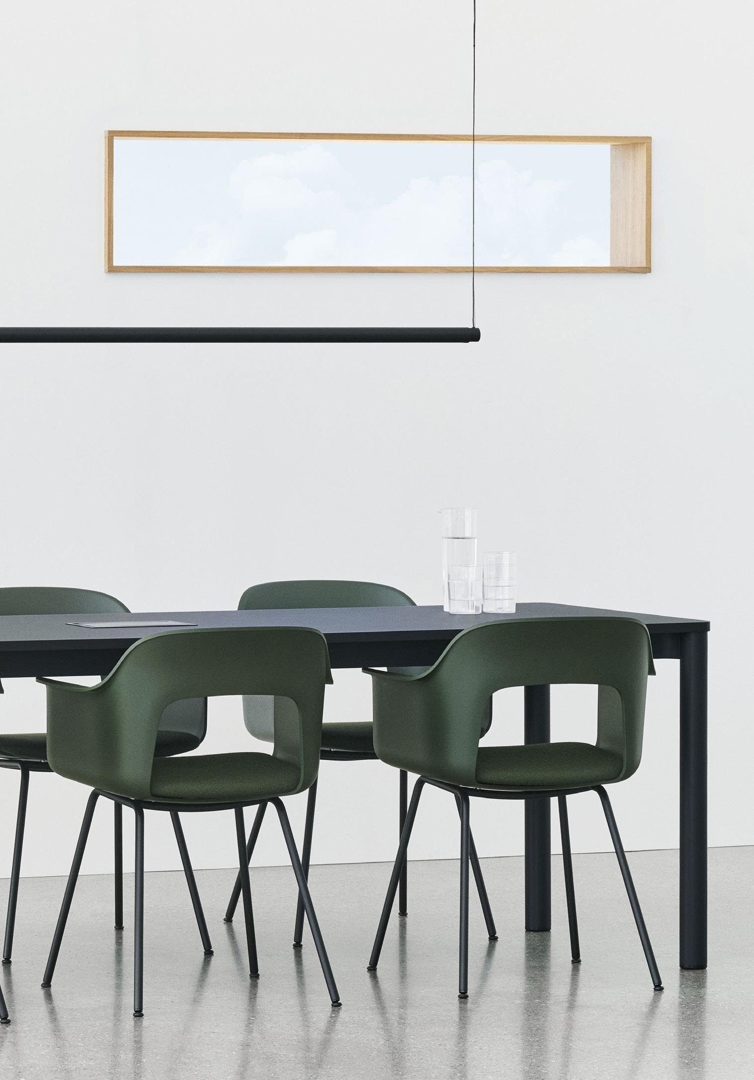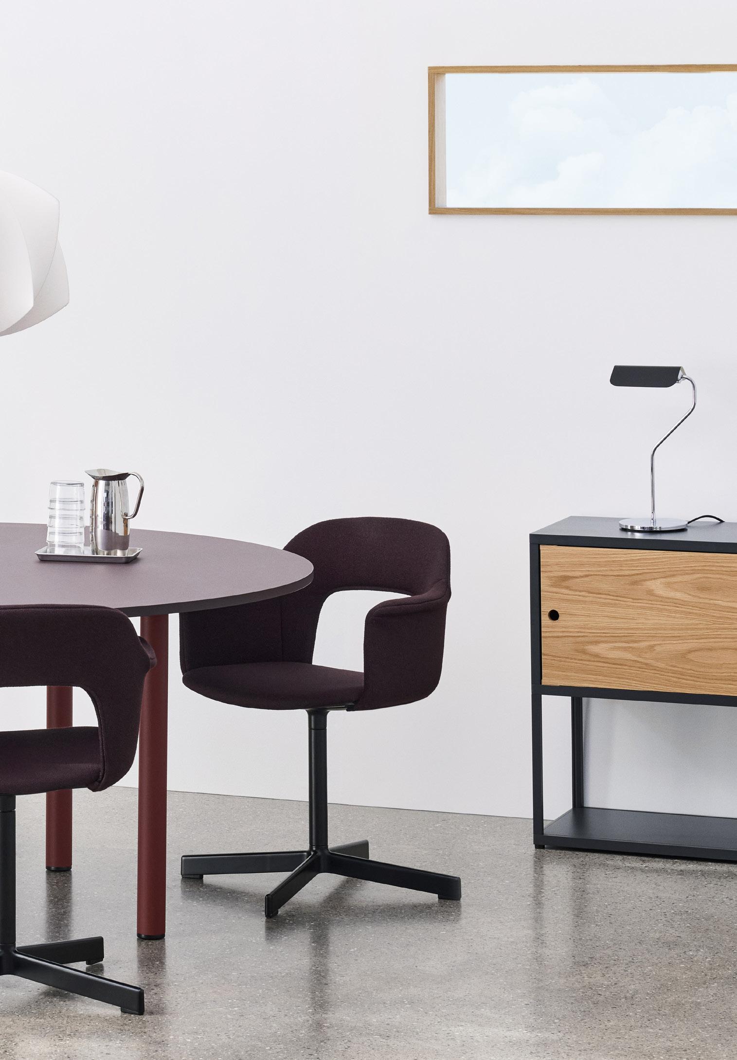 Defined by the opening in the backrest, the armchair has a light, transparent expression, while the integrated armrests provide added comfort and support. Generous yet versatile, it is well suited to meeting rooms, workspaces, and hospitality environments.