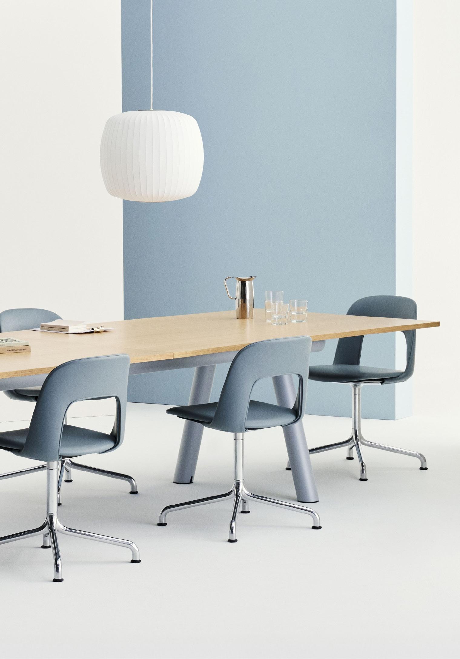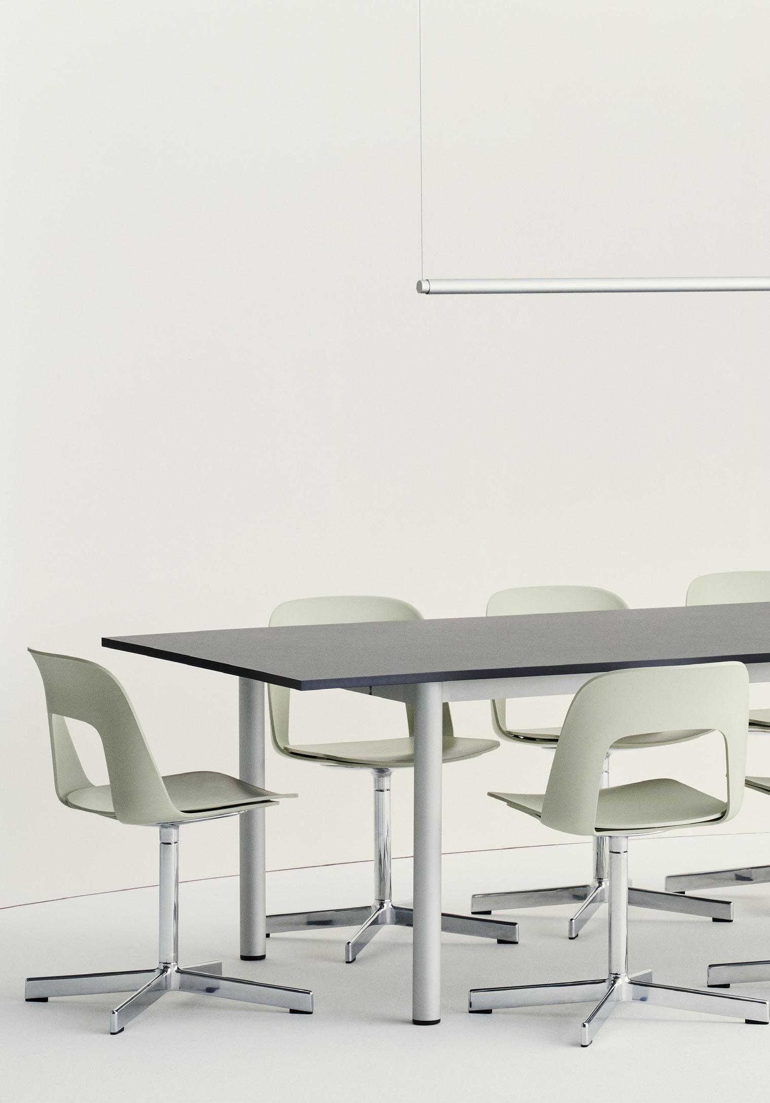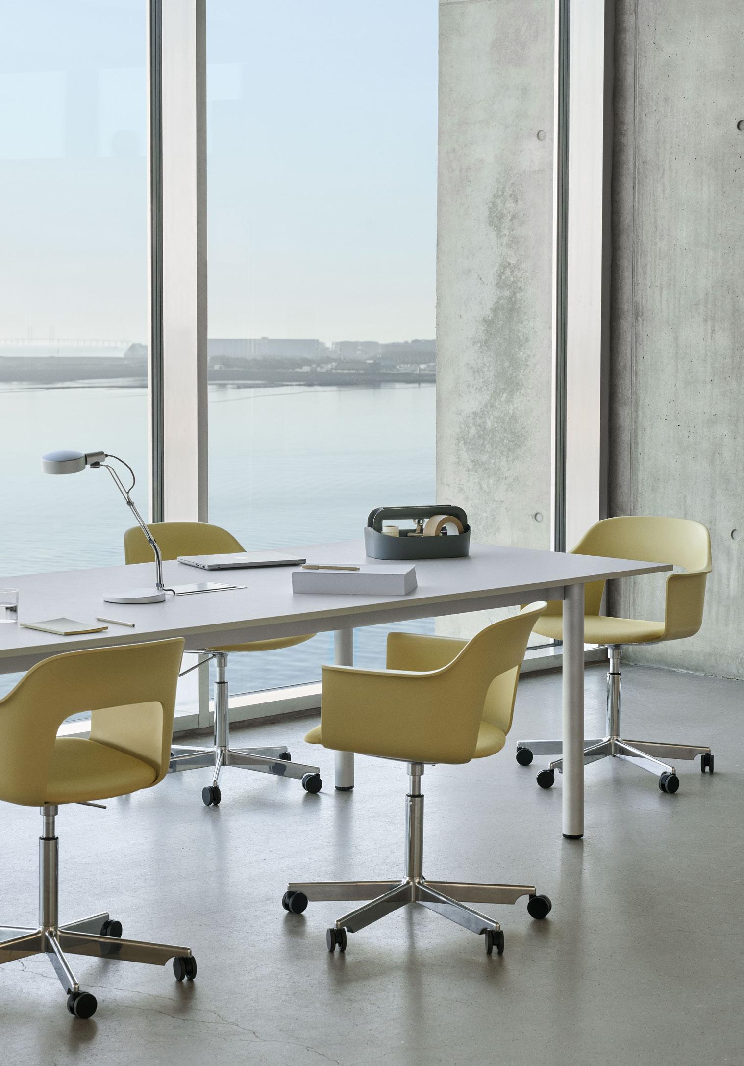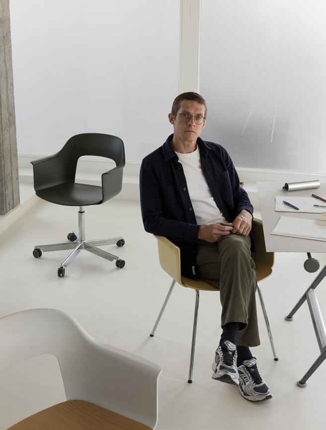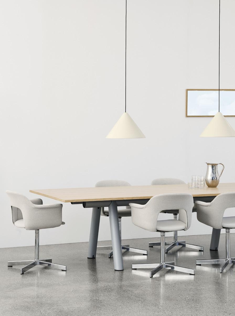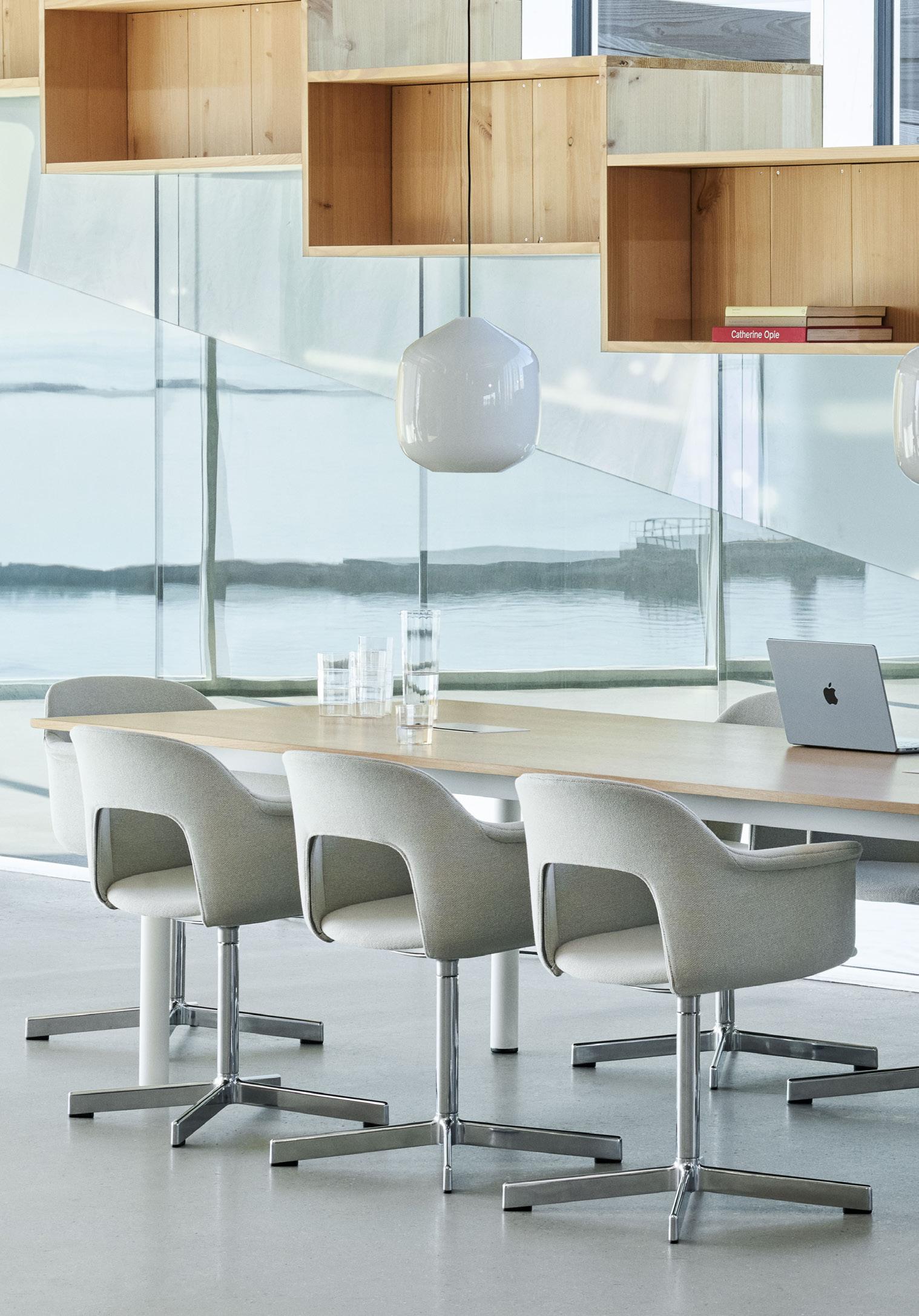 Defined by the opening in the backrest, the armchair has a light, transparent expression, while the integrated armrests provide added comfort and support. Generous yet versatile, it is well suited to meeting rooms, workspaces, and hospitality environments.