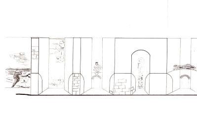 Left: aerial plan, south elevation, south longitudinal section, north longitudinal section