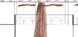 The technical diagrams highlight the historical analysis done on the host structure through the representation of materiality and perforations. The aluminum paneling of the aerial plan and south elevation most clearly exhibits how the perforations in that particular material are modeled after the shape of iron ore. The perforations in the rustcolored Corten Steel panels, shown in the longitudinal sections, are based off of the shape of liquidized iron as it is being smelted. The north longitudinal section includes a wall made from Corten Steel that, instead of being perforated, is etched in a pattern implicative of what iron ore looks like when it is just beginning to melt. The coloring of the metal panels and the designs that have either been cut or etched into them honor the past life of The Iron Furnaces by basing themselves off of The Furnaces’ original programming of smelting iron.