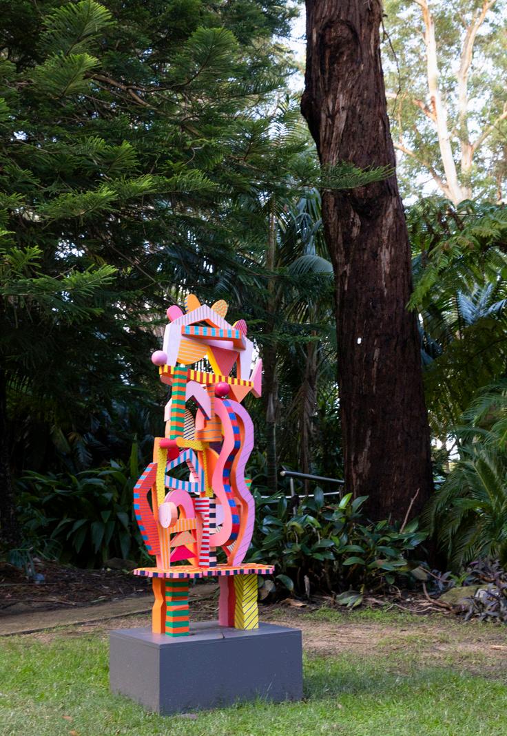 The sculptures are hand-cut from pine timber using electric and hand saws. With each containing numerous parts the process of assembling the works in part references the sketches with an element of improvisation. The sculptures are then painted with bright colours and repetitive patterns to create dynamic forms set against the backdrop of the lush Hazelhurst Gardens.