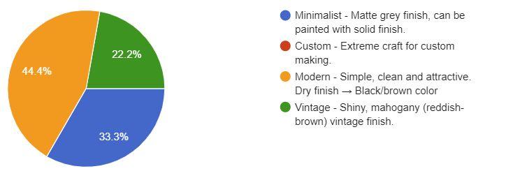 In terms of style and aesthetics, this question provides a variety of options.The pie chart above presents that the majority: 44.4% of people are looking for a modern, simple and clean finish.This clearly shows that the modern look of my product is desired by a higher percentage of consumers. In terms of designing, I will explore recent modern designs from the market to help capture the parts and create my final design, which should appeal to many consumers and have a high demand like most other headphone stands.
