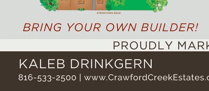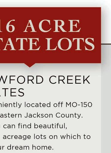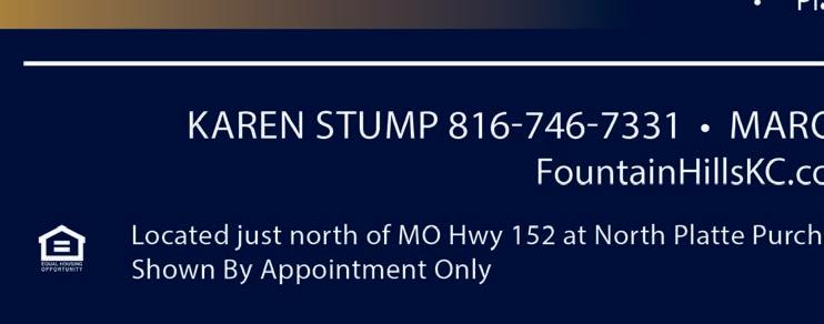 WATER VIEWS • TREES & MORE TREES • WALKOUT HOME SITES • TRAILS OPEN TO OUTSIDE BUILDERS | SOUTH SIDE OF 71ST ST. BETWEEN PFLUMM & QUIVIRA, SHAWNEE, KS the MANORS Single Family Home Site s From the mid $600’s the RESIDENCES Estate Home Sites From the mid $800’s+ the COTTAGES Maintenance-Provided Villa Home Sites From the mid $500’s 913.340.3962 • KENNETHESTATES.COM LOCATED INSIDE THE I-435 LOOP VISIT OUR PARADE ENTRIES #251 & #252 Brokerage: 913-491-1001 14