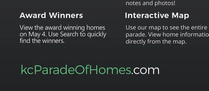 Not all homes featured in the Spring Parade of Homes Guide may be complete at the start of the Parade. Call the builders for completion information or visit www.KCParadeofHomes.com or download the KC Parade of Homes mobile app in the Google Play or Apple Store.