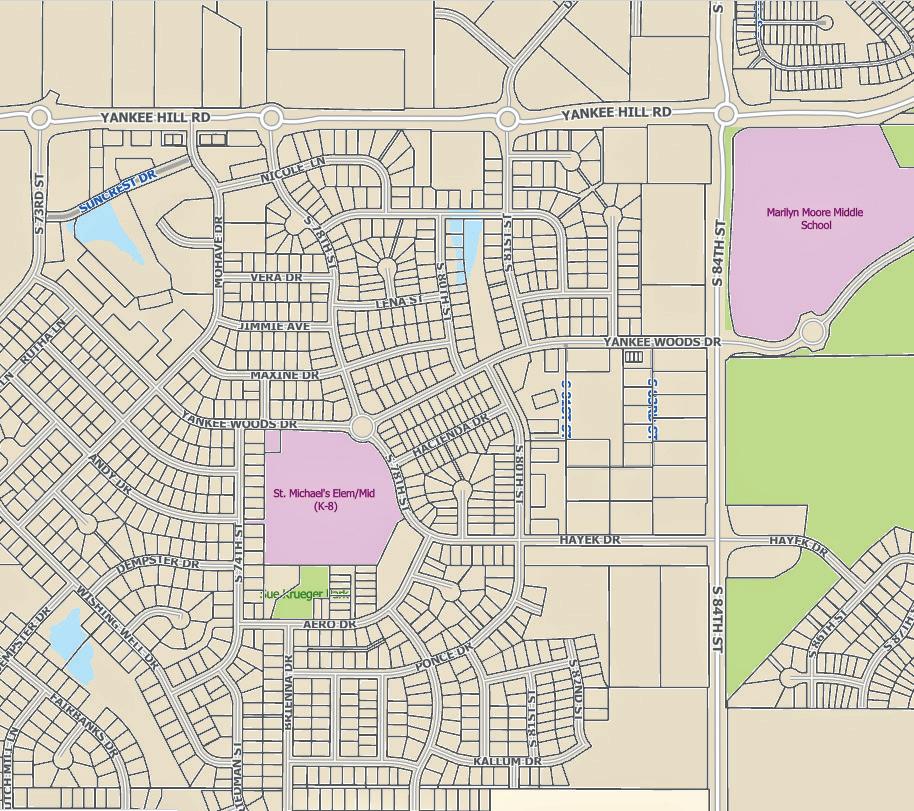 DIRECTIONS: From S. 84th and A Streets, go east on A St. At the second roundabout, turn north on S. 93rd St. At the next roundabout, take the first exit on Hillcrest Trl. Turn north on S. 94th Street.