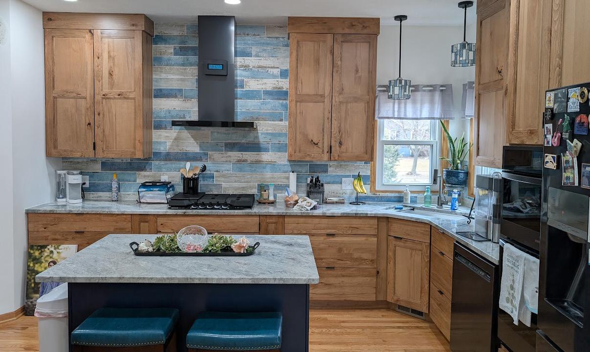 Showplace Cabinetry in Hickory Tawny stain in Kitchen & Hickory Dusk stain in Bath