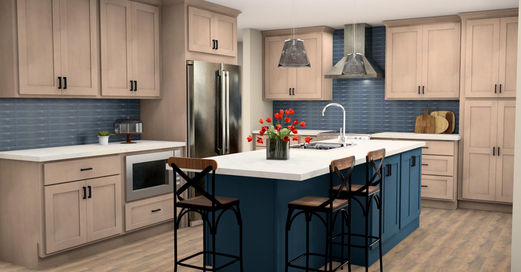 Kitchen Backsplash Tile in 3” x 16” glossy blue color with decorative accent tile at the stove