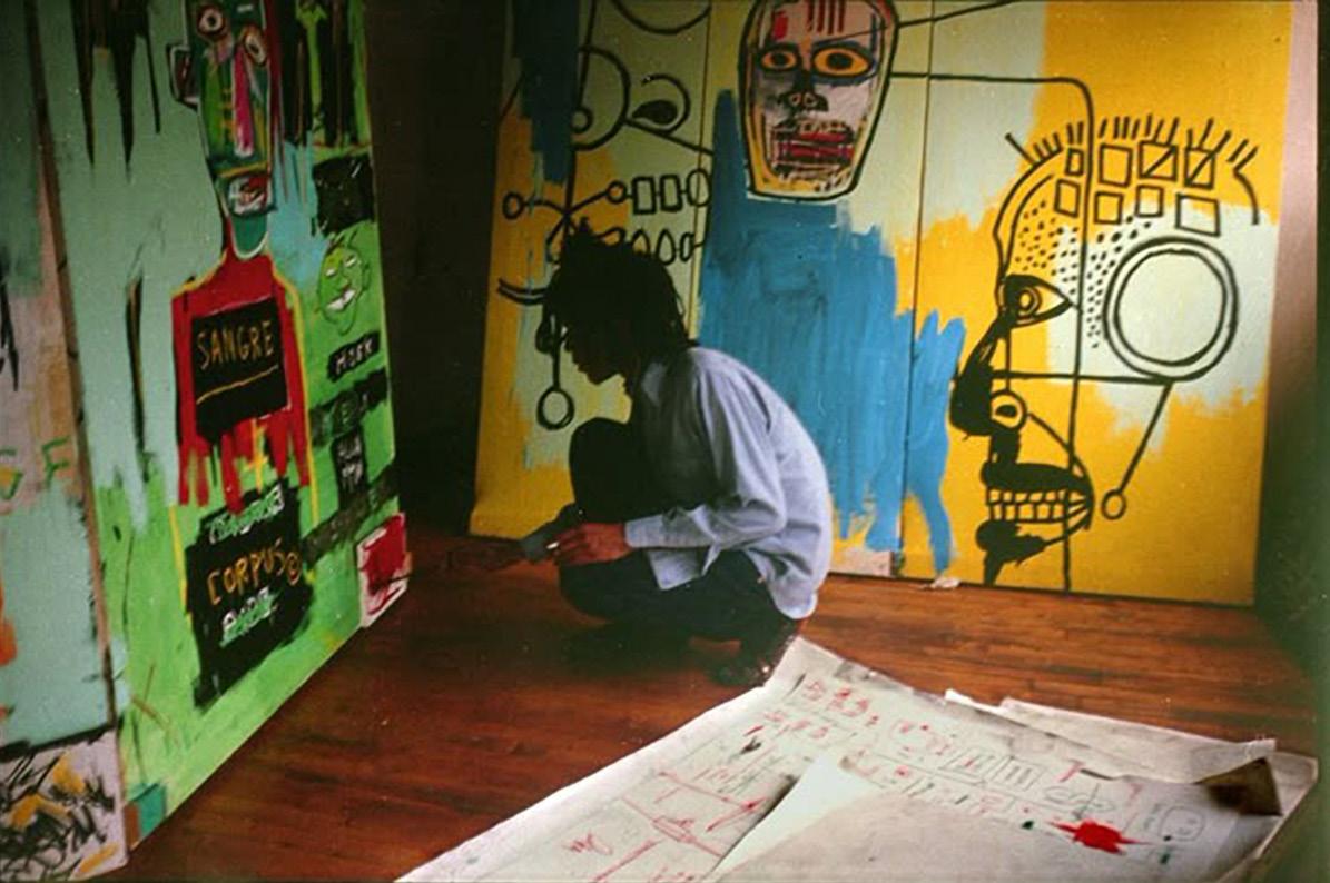 Jean-Michel Basquiat painting in his Crosby Street studio (1983)
