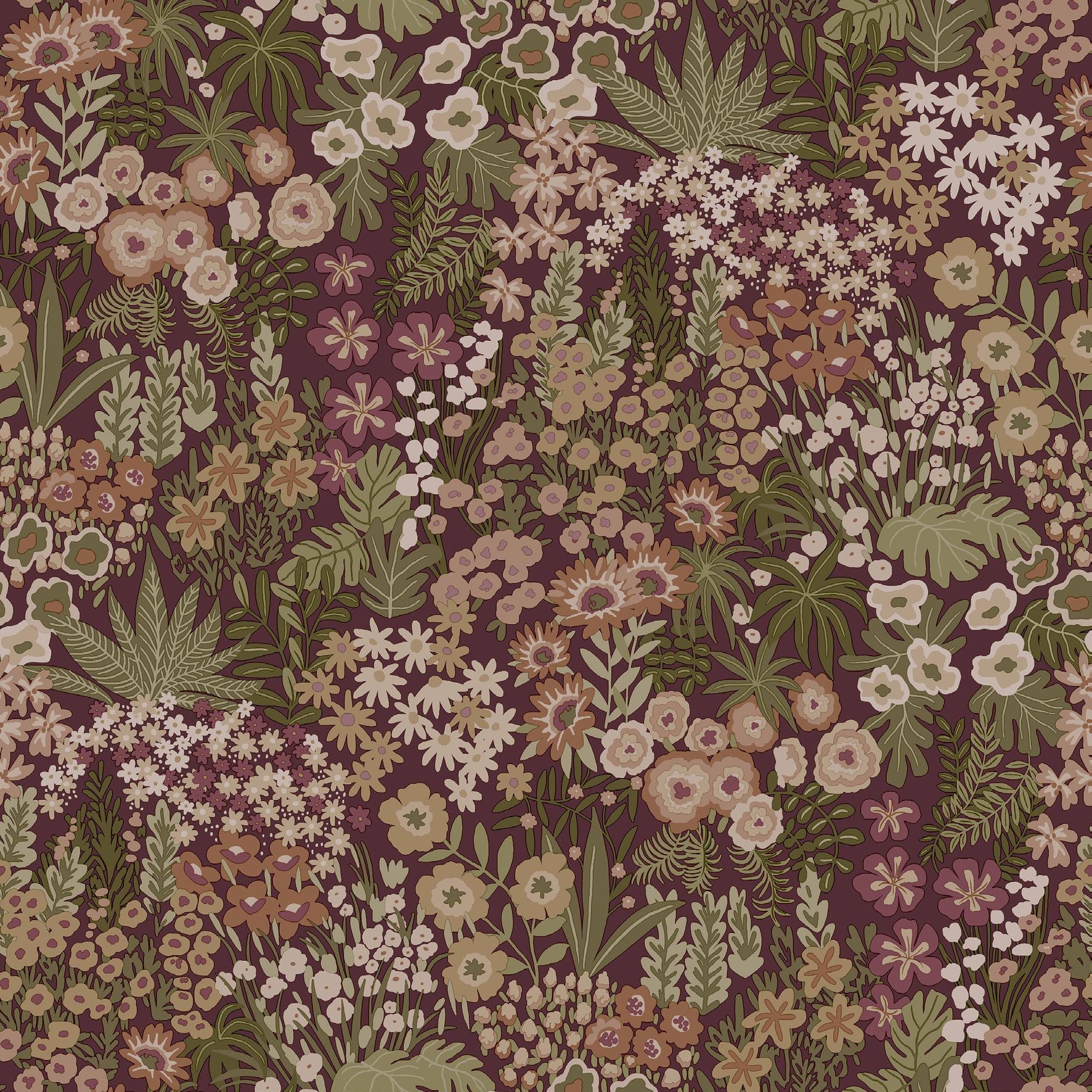An allover floral pattern featuring dense, ditsy motifs in a uniform repeat, giving the impression of a continuous full bloom garden. In various soft yet impactful colourways, simplistic shapes are enhanced without overwhelming the space.